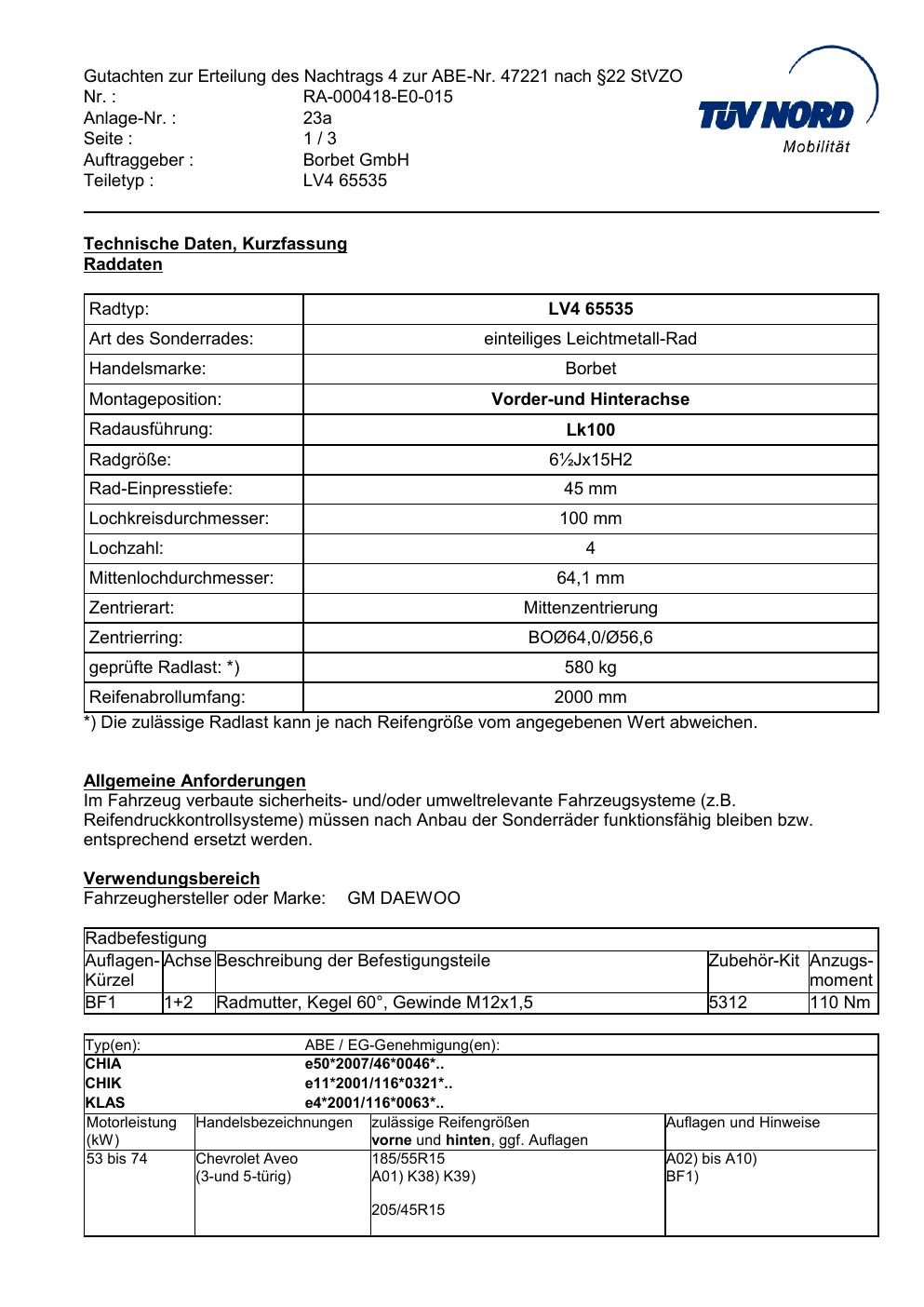 Dieses Gutachten (abe) bezieht sich auf die Alufelge Borbet LV4 65535 in der Ausführung ET 0, Mittenloch 0 mm (KBA 47221). Im PDF findest du typischerweise zulässige Reifengrößen, Auflagen/Anbauhinweise und – je nach Dokument – Hinweise zur Eintragung.