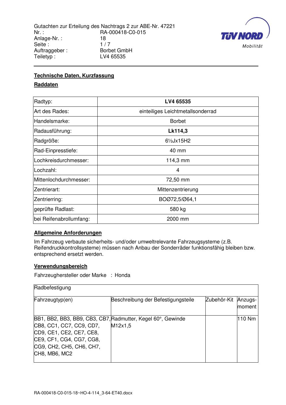 Dieses Gutachten (abe) bezieht sich auf die Alufelge Borbet LV4 65535 in der Ausführung ET 0, Mittenloch 0 mm (KBA 47221). Im PDF findest du typischerweise zulässige Reifengrößen, Auflagen/Anbauhinweise und – je nach Dokument – Hinweise zur Eintragung.