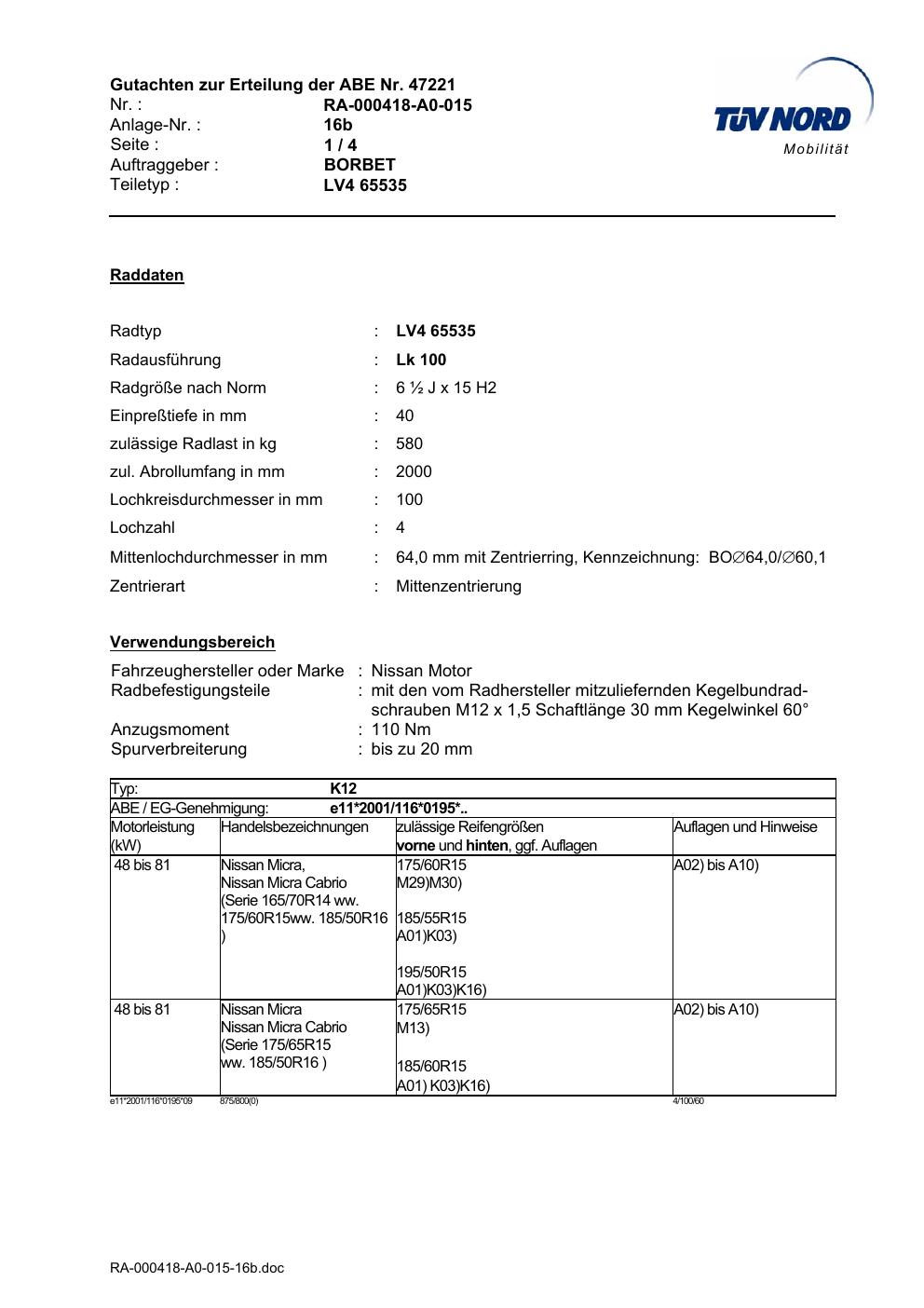 Dieses Gutachten (abe) bezieht sich auf die Alufelge Borbet LV4 65535 in der Ausführung ET 0, Mittenloch 0 mm (KBA 47221). Im PDF findest du typischerweise zulässige Reifengrößen, Auflagen/Anbauhinweise und – je nach Dokument – Hinweise zur Eintragung.