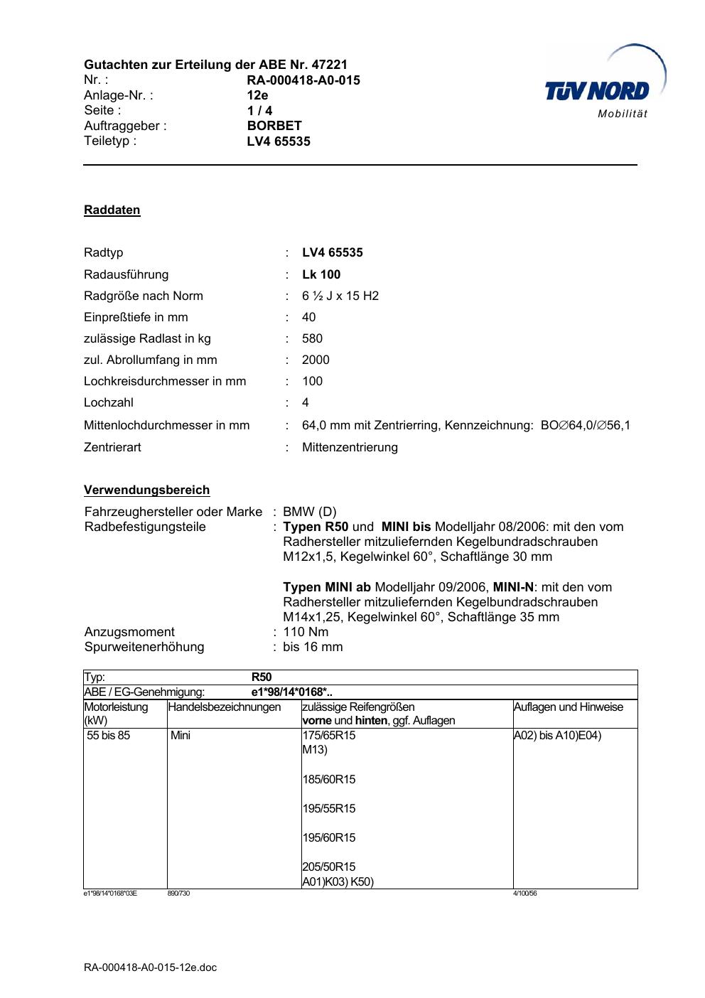 Dieses Gutachten (abe) bezieht sich auf die Alufelge Borbet LV4 65535 in der Ausführung ET 0, Mittenloch 0 mm (KBA 47221). Im PDF findest du typischerweise zulässige Reifengrößen, Auflagen/Anbauhinweise und – je nach Dokument – Hinweise zur Eintragung.