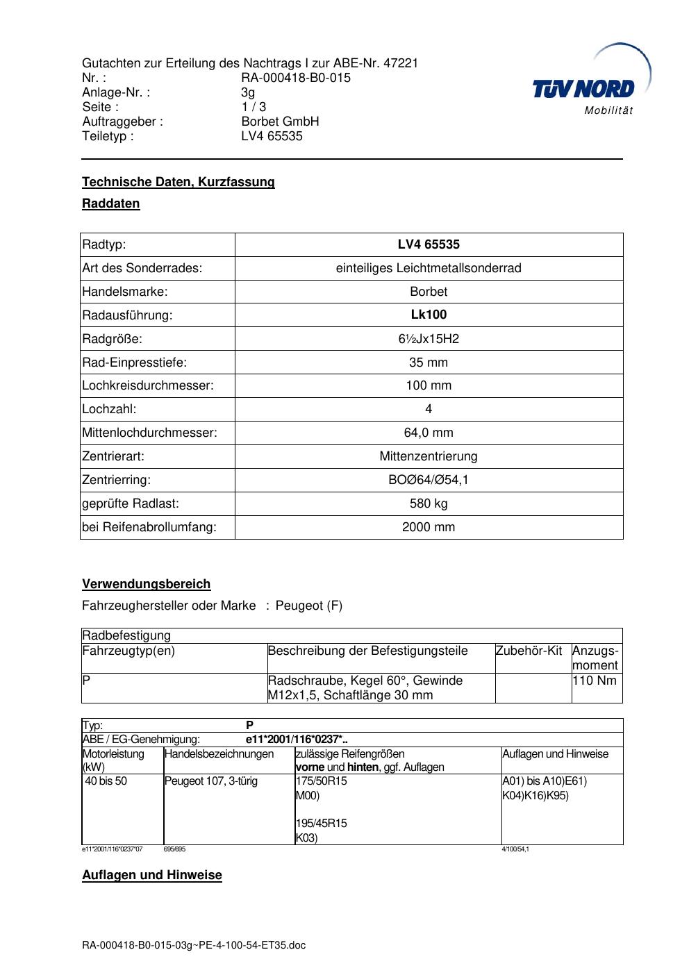 Dieses Gutachten (abe) bezieht sich auf die Alufelge Borbet LV4 65535 in der Ausführung ET 0, Mittenloch 0 mm (KBA 47221). Im PDF findest du typischerweise zulässige Reifengrößen, Auflagen/Anbauhinweise und – je nach Dokument – Hinweise zur Eintragung.