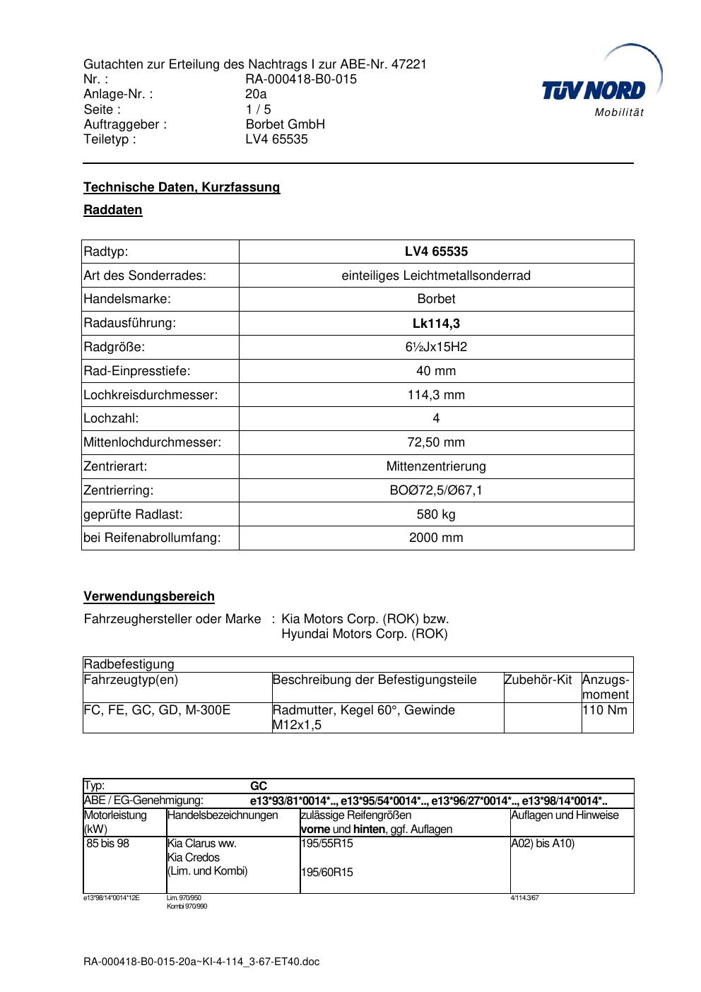 Dieses Gutachten (abe) bezieht sich auf die Alufelge Borbet LV4 65535 in der Ausführung ET 0, Mittenloch 0 mm (KBA 47221). Im PDF findest du typischerweise zulässige Reifengrößen, Auflagen/Anbauhinweise und – je nach Dokument – Hinweise zur Eintragung.