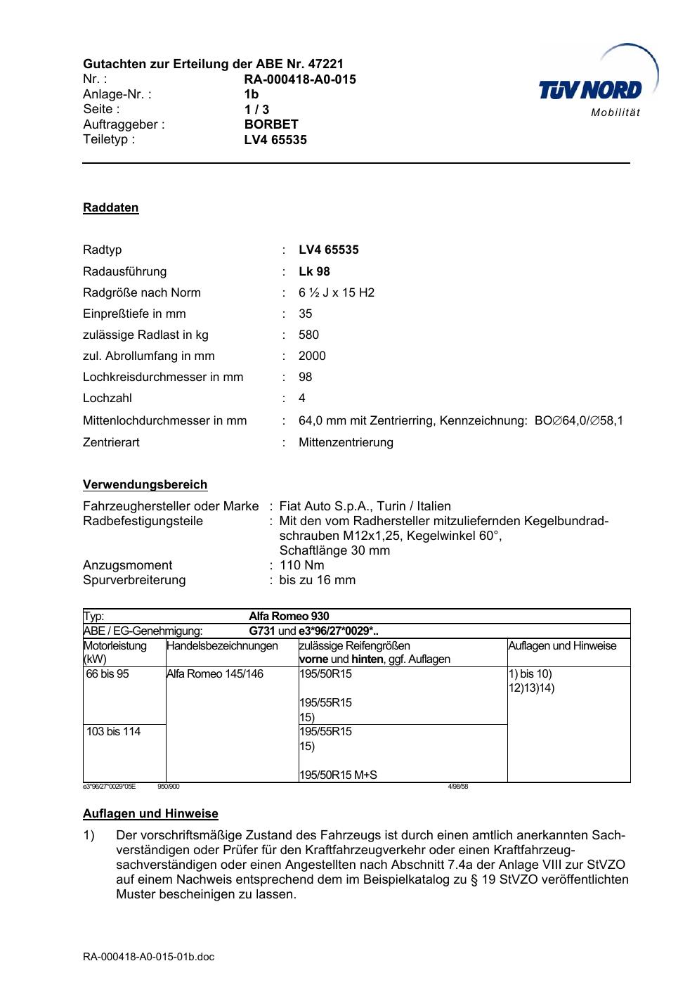 Dieses Gutachten (abe) bezieht sich auf die Alufelge Borbet LV4 65535 in der Ausführung ET 0, Mittenloch 0 mm (KBA 47221). Im PDF findest du typischerweise zulässige Reifengrößen, Auflagen/Anbauhinweise und – je nach Dokument – Hinweise zur Eintragung.