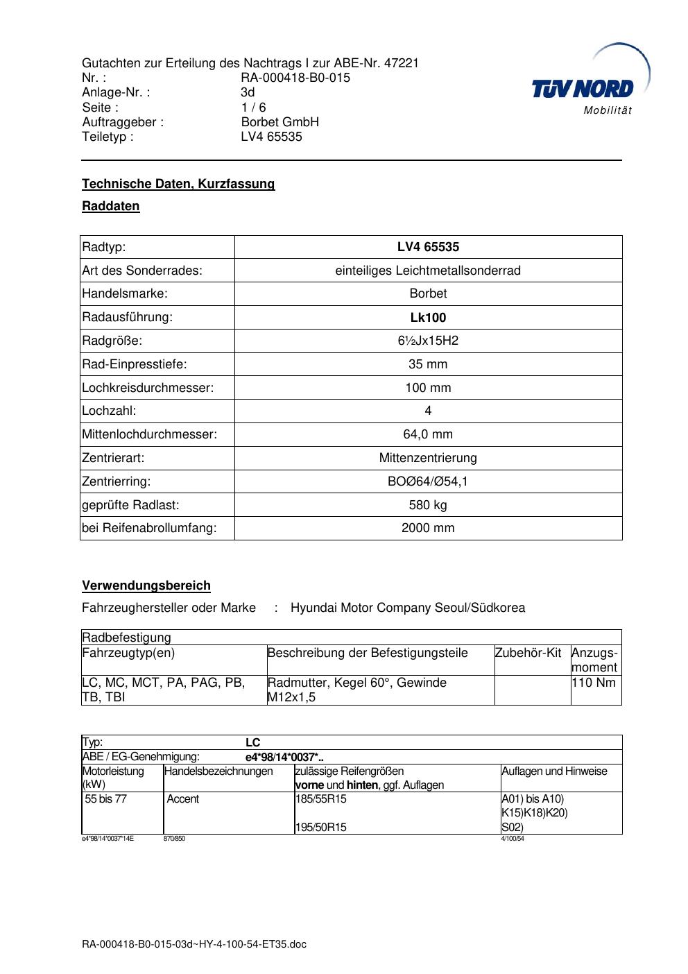 Dieses Gutachten (abe) bezieht sich auf die Alufelge Borbet LV4 65535 in der Ausführung ET 0, Mittenloch 0 mm (KBA 47221). Im PDF findest du typischerweise zulässige Reifengrößen, Auflagen/Anbauhinweise und – je nach Dokument – Hinweise zur Eintragung.