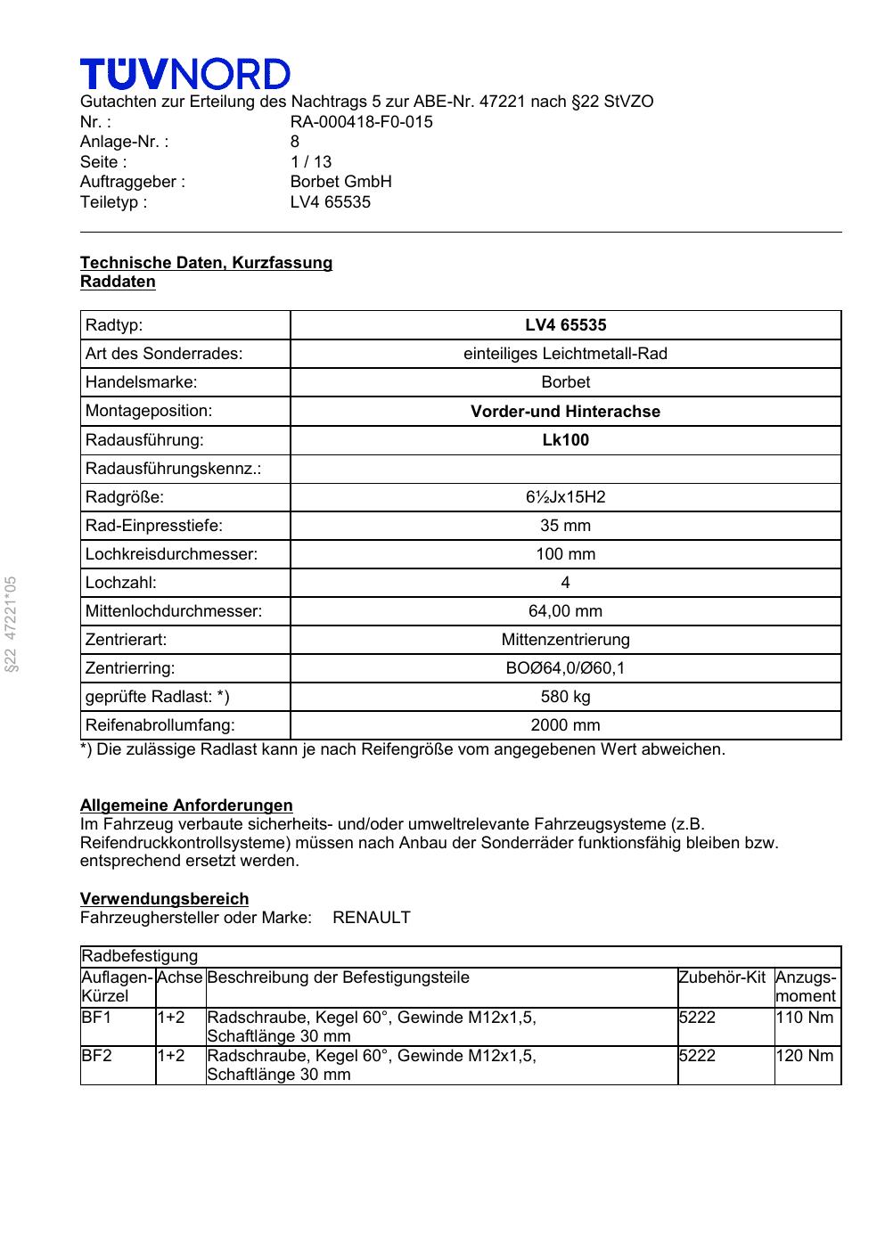 Dieses Gutachten (abe) bezieht sich auf die Alufelge Borbet LV4 65535 in der Ausführung ET 0, Mittenloch 0 mm (KBA 47221). Im PDF findest du typischerweise zulässige Reifengrößen, Auflagen/Anbauhinweise und – je nach Dokument – Hinweise zur Eintragung.