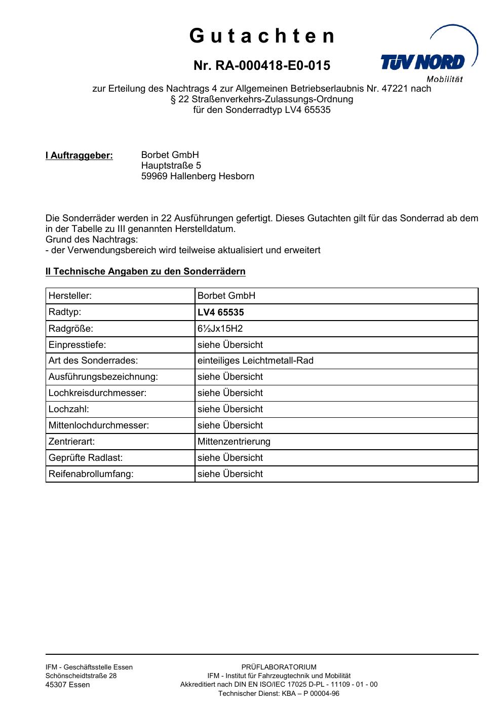 Dieses Gutachten (abe) bezieht sich auf die Alufelge Borbet LV4 65535 in der Ausführung ET 0, Mittenloch 0 mm (KBA 47221). Im PDF findest du typischerweise zulässige Reifengrößen, Auflagen/Anbauhinweise und – je nach Dokument – Hinweise zur Eintragung.