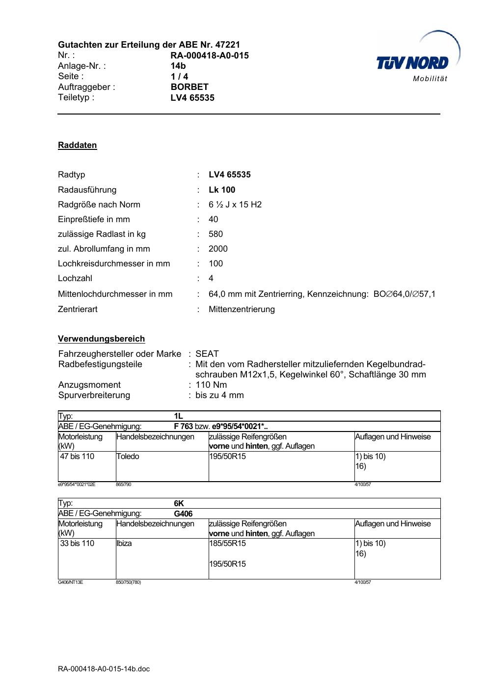 Dieses Gutachten (abe) bezieht sich auf die Alufelge Borbet LV4 65535 in der Ausführung ET 0, Mittenloch 0 mm (KBA 47221). Im PDF findest du typischerweise zulässige Reifengrößen, Auflagen/Anbauhinweise und – je nach Dokument – Hinweise zur Eintragung.