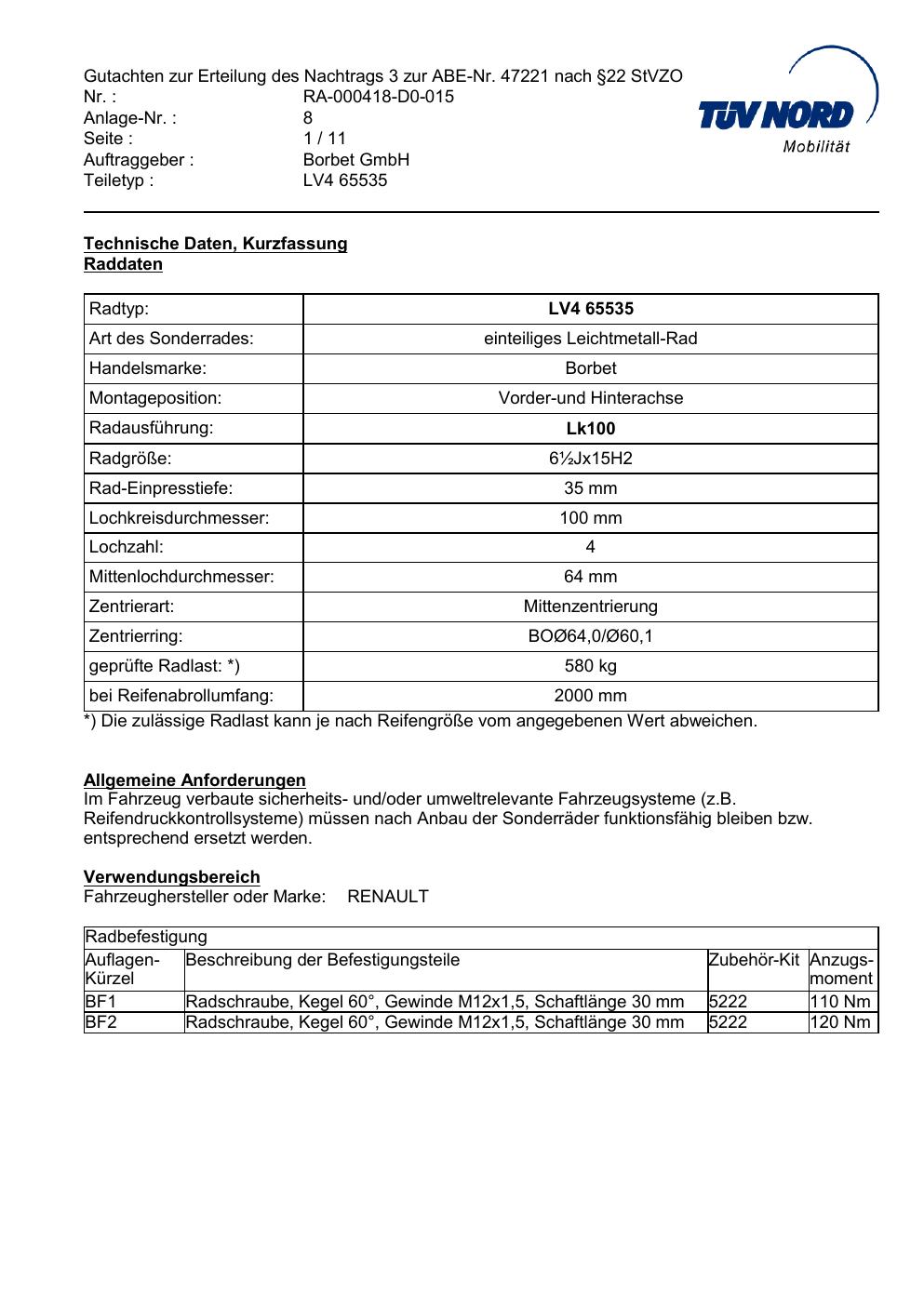 Dieses Gutachten (abe) bezieht sich auf die Alufelge Borbet LV4 65535 in der Ausführung ET 0, Mittenloch 0 mm (KBA 47221). Im PDF findest du typischerweise zulässige Reifengrößen, Auflagen/Anbauhinweise und – je nach Dokument – Hinweise zur Eintragung.