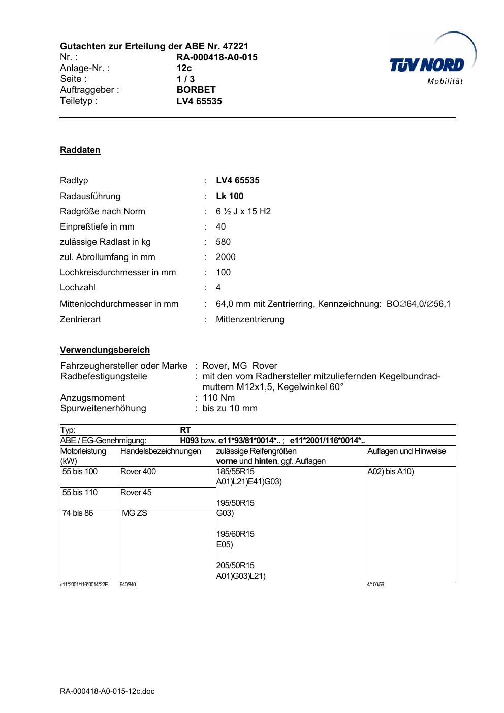Dieses Gutachten (abe) bezieht sich auf die Alufelge Borbet LV4 65535 in der Ausführung ET 0, Mittenloch 0 mm (KBA 47221). Im PDF findest du typischerweise zulässige Reifengrößen, Auflagen/Anbauhinweise und – je nach Dokument – Hinweise zur Eintragung.