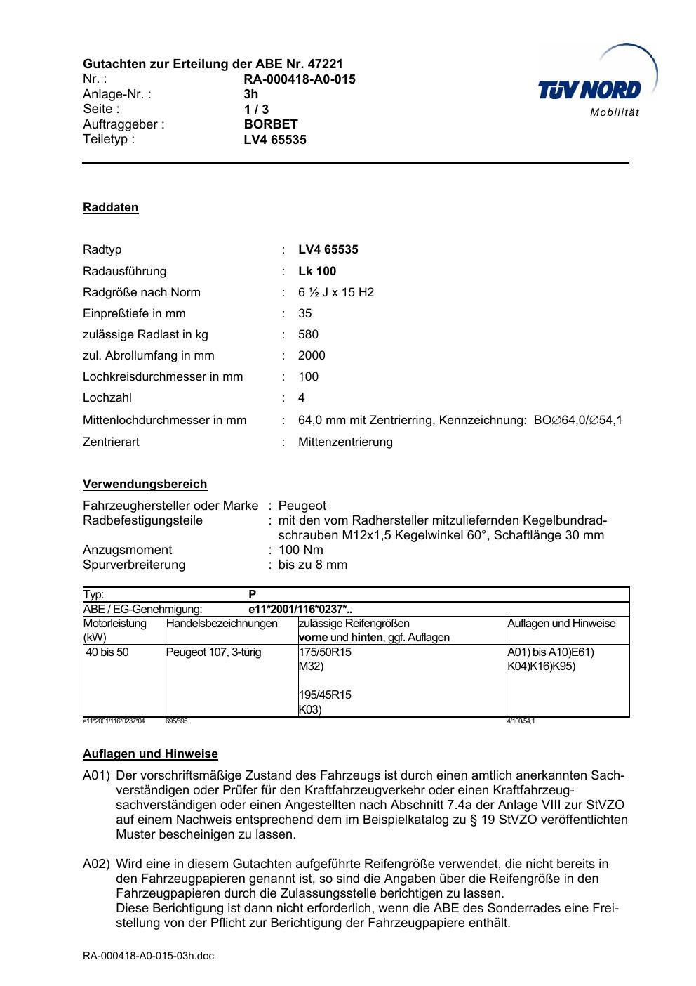 Dieses Gutachten (abe) bezieht sich auf die Alufelge Borbet LV4 65535 in der Ausführung ET 0, Mittenloch 0 mm (KBA 47221). Im PDF findest du typischerweise zulässige Reifengrößen, Auflagen/Anbauhinweise und – je nach Dokument – Hinweise zur Eintragung.