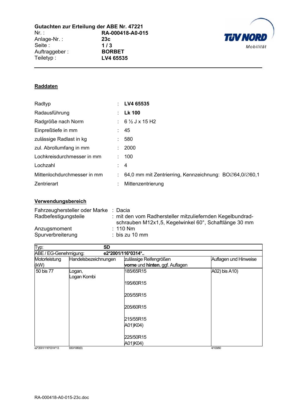 Dieses Gutachten (abe) bezieht sich auf die Alufelge Borbet LV4 65535 in der Ausführung ET 0, Mittenloch 0 mm (KBA 47221). Im PDF findest du typischerweise zulässige Reifengrößen, Auflagen/Anbauhinweise und – je nach Dokument – Hinweise zur Eintragung.