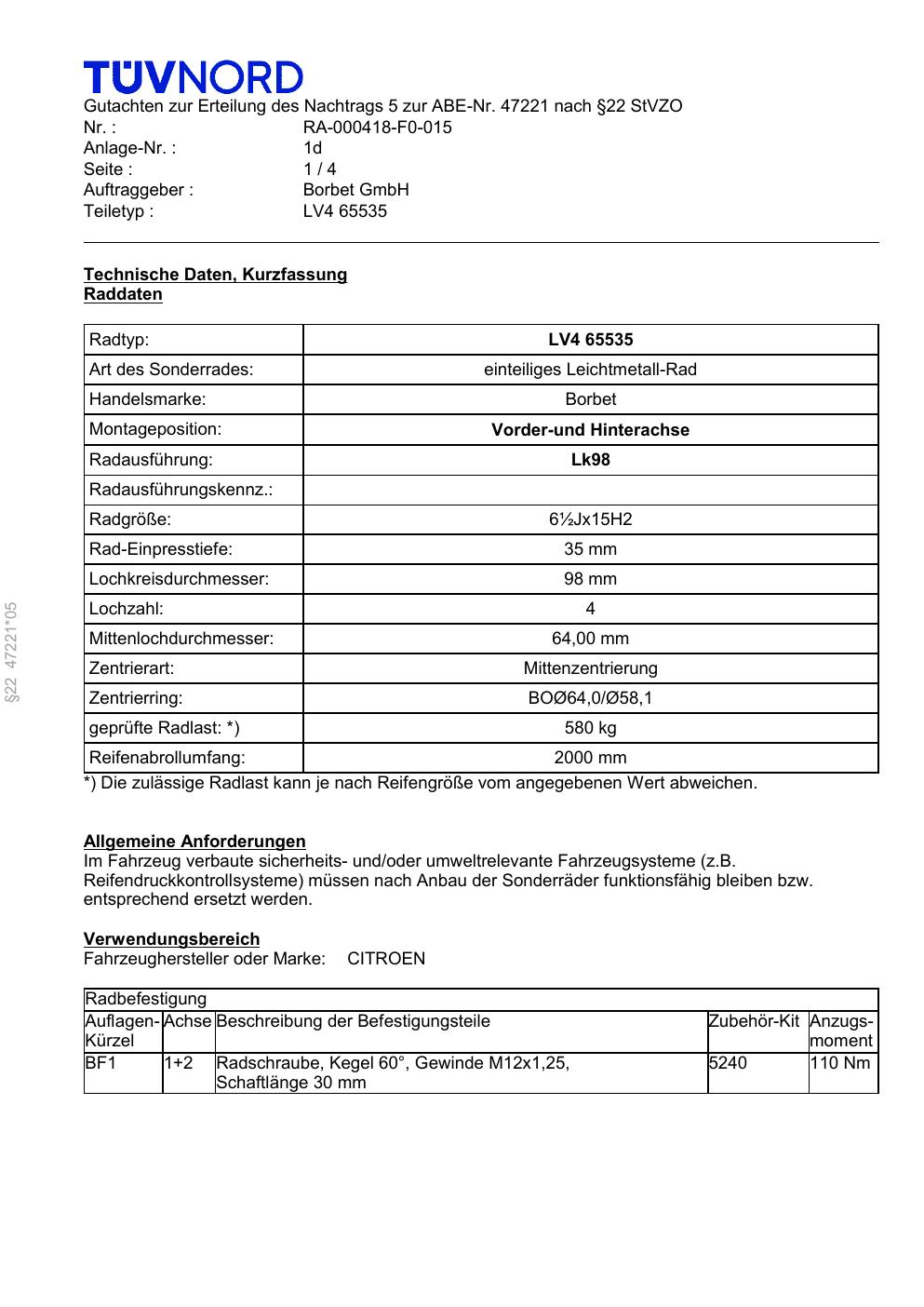Dieses Gutachten (abe) bezieht sich auf die Alufelge Borbet LV4 65535 in der Ausführung ET 0, Mittenloch 0 mm (KBA 47221). Im PDF findest du typischerweise zulässige Reifengrößen, Auflagen/Anbauhinweise und – je nach Dokument – Hinweise zur Eintragung.