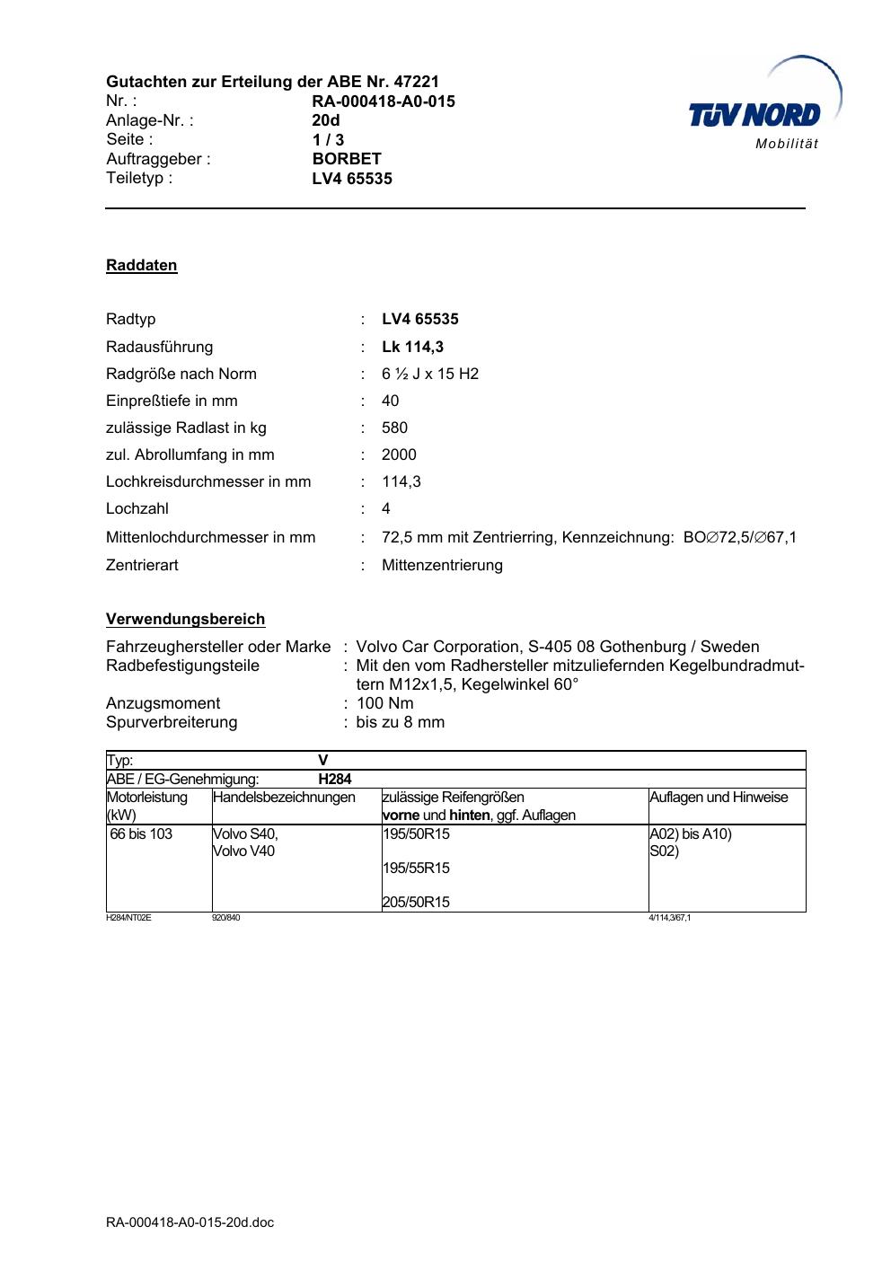 Dieses Gutachten (abe) bezieht sich auf die Alufelge Borbet LV4 65535 in der Ausführung ET 0, Mittenloch 0 mm (KBA 47221). Im PDF findest du typischerweise zulässige Reifengrößen, Auflagen/Anbauhinweise und – je nach Dokument – Hinweise zur Eintragung.