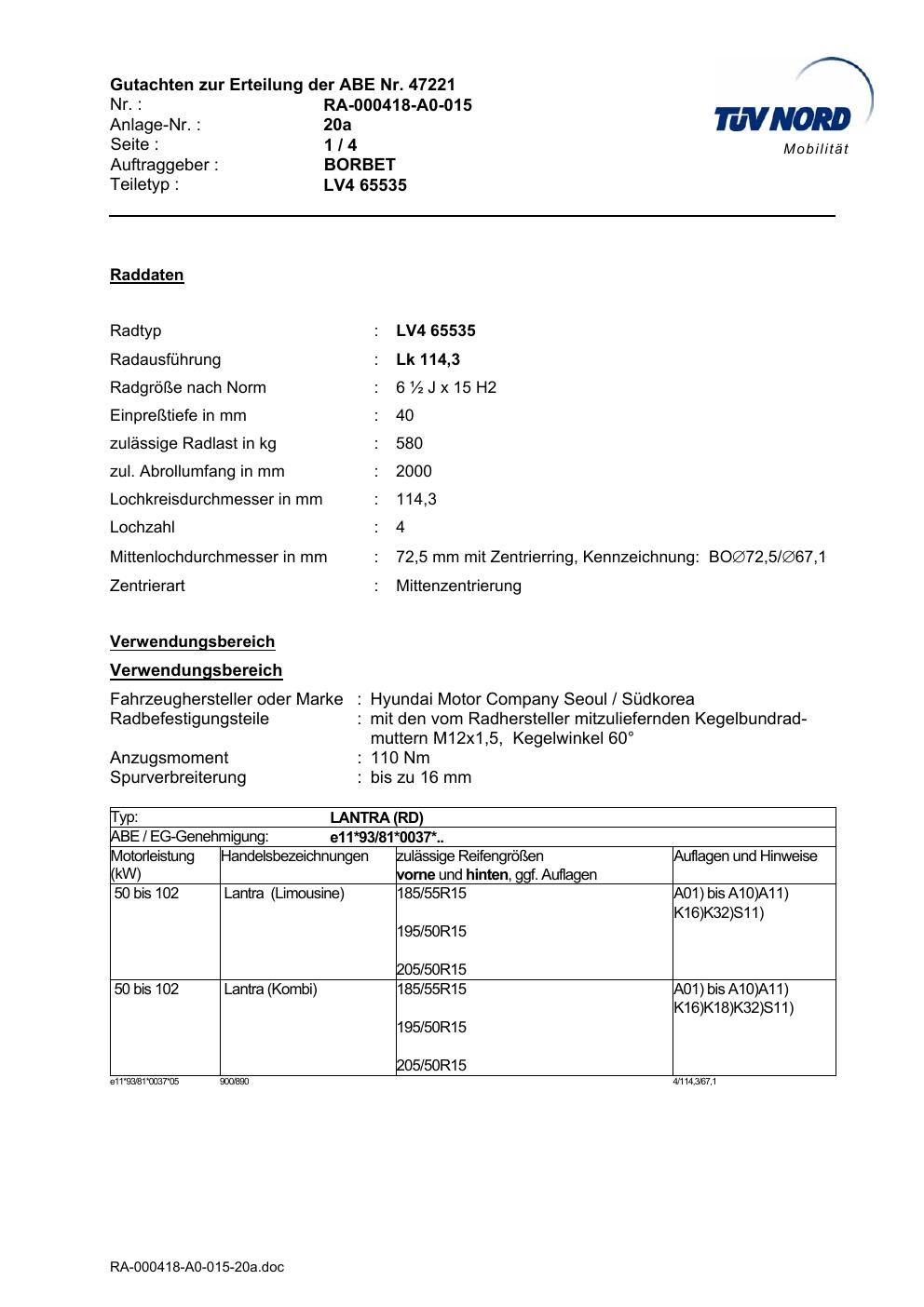 Dieses Gutachten (abe) bezieht sich auf die Alufelge Borbet LV4 65535 in der Ausführung ET 0, Mittenloch 0 mm (KBA 47221). Im PDF findest du typischerweise zulässige Reifengrößen, Auflagen/Anbauhinweise und – je nach Dokument – Hinweise zur Eintragung.