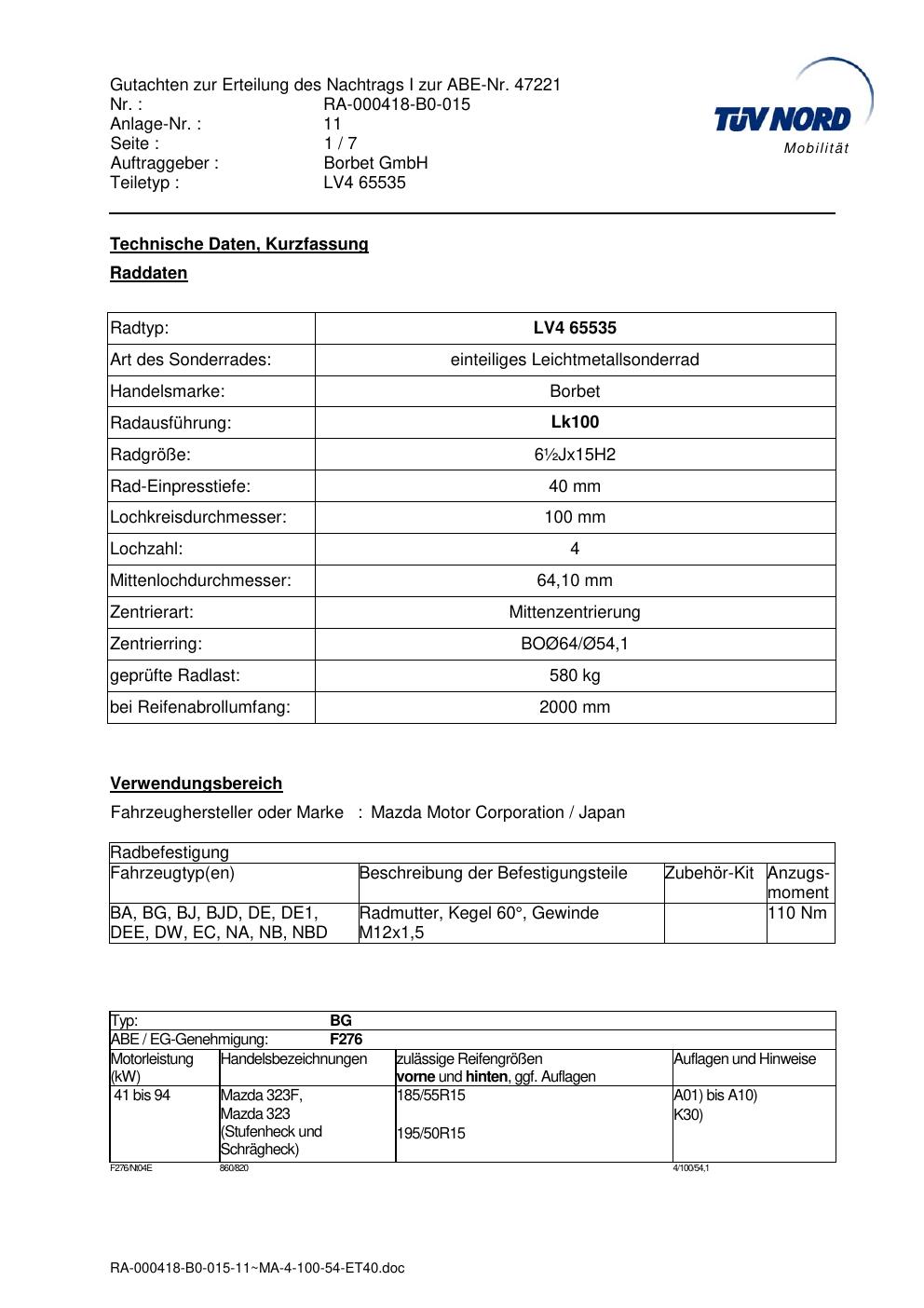 Dieses Gutachten (abe) bezieht sich auf die Alufelge Borbet LV4 65535 in der Ausführung ET 0, Mittenloch 0 mm (KBA 47221). Im PDF findest du typischerweise zulässige Reifengrößen, Auflagen/Anbauhinweise und – je nach Dokument – Hinweise zur Eintragung.