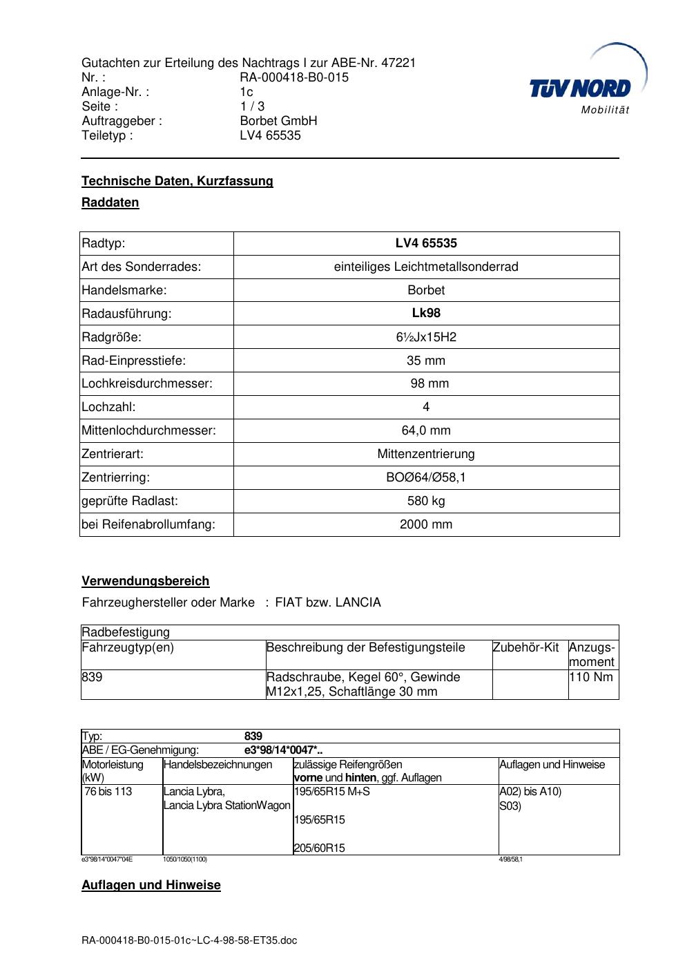 Dieses Gutachten (abe) bezieht sich auf die Alufelge Borbet LV4 65535 in der Ausführung ET 0, Mittenloch 0 mm (KBA 47221). Im PDF findest du typischerweise zulässige Reifengrößen, Auflagen/Anbauhinweise und – je nach Dokument – Hinweise zur Eintragung.