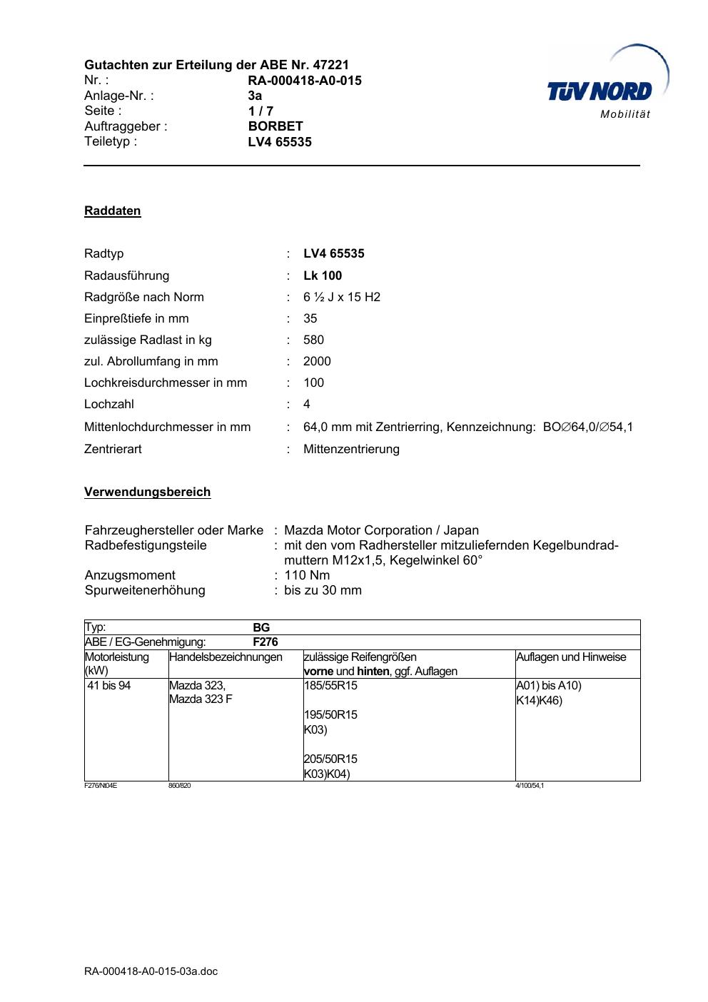 Dieses Gutachten (abe) bezieht sich auf die Alufelge brand-borbet LV4 65535 in der Ausführung ET 0, Mittenloch 0 mm (KBA 47221). Im PDF findest du typischerweise zulässige Reifengrößen, Auflagen/Anbauhinweise und – je nach Dokument – Hinweise zur Eintragung.