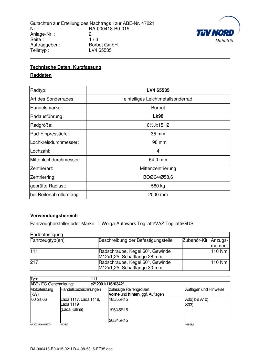 Dieses Gutachten (abe) bezieht sich auf die Alufelge Borbet LV4 65535 in der Ausführung ET 0, Mittenloch 0 mm (KBA 47221). Im PDF findest du typischerweise zulässige Reifengrößen, Auflagen/Anbauhinweise und – je nach Dokument – Hinweise zur Eintragung.
