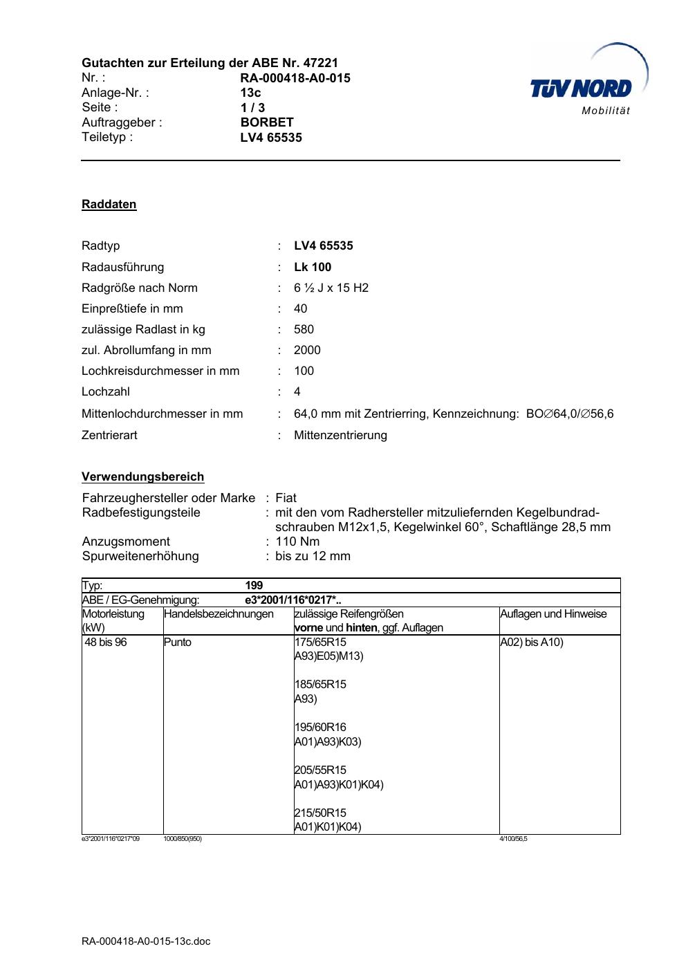 Dieses Gutachten (abe) bezieht sich auf die Alufelge Borbet LV4 65535 in der Ausführung ET 0, Mittenloch 0 mm (KBA 47221). Im PDF findest du typischerweise zulässige Reifengrößen, Auflagen/Anbauhinweise und – je nach Dokument – Hinweise zur Eintragung.
