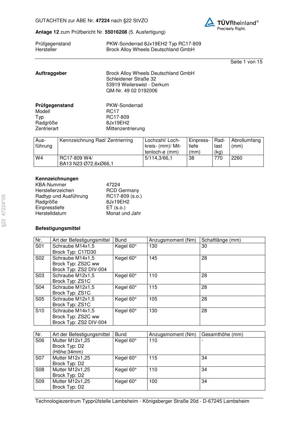 Dieses Gutachten (abe) bezieht sich auf die Alufelge Brock RC17-809 in der Ausführung ET 0, Mittenloch 0 mm (KBA 47224). Im PDF findest du typischerweise zulässige Reifengrößen, Auflagen/Anbauhinweise und – je nach Dokument – Hinweise zur Eintragung.
