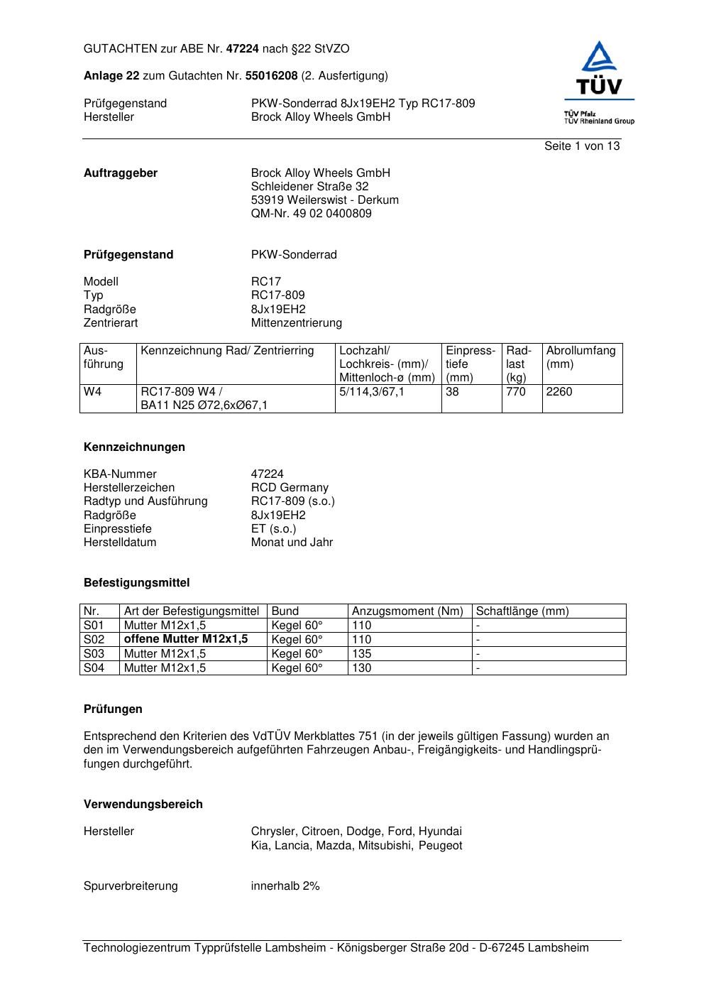 Dieses Gutachten (abe) bezieht sich auf die Alufelge Brock RC17-809 in der Ausführung ET 0, Mittenloch 0 mm (KBA 47224). Im PDF findest du typischerweise zulässige Reifengrößen, Auflagen/Anbauhinweise und – je nach Dokument – Hinweise zur Eintragung.