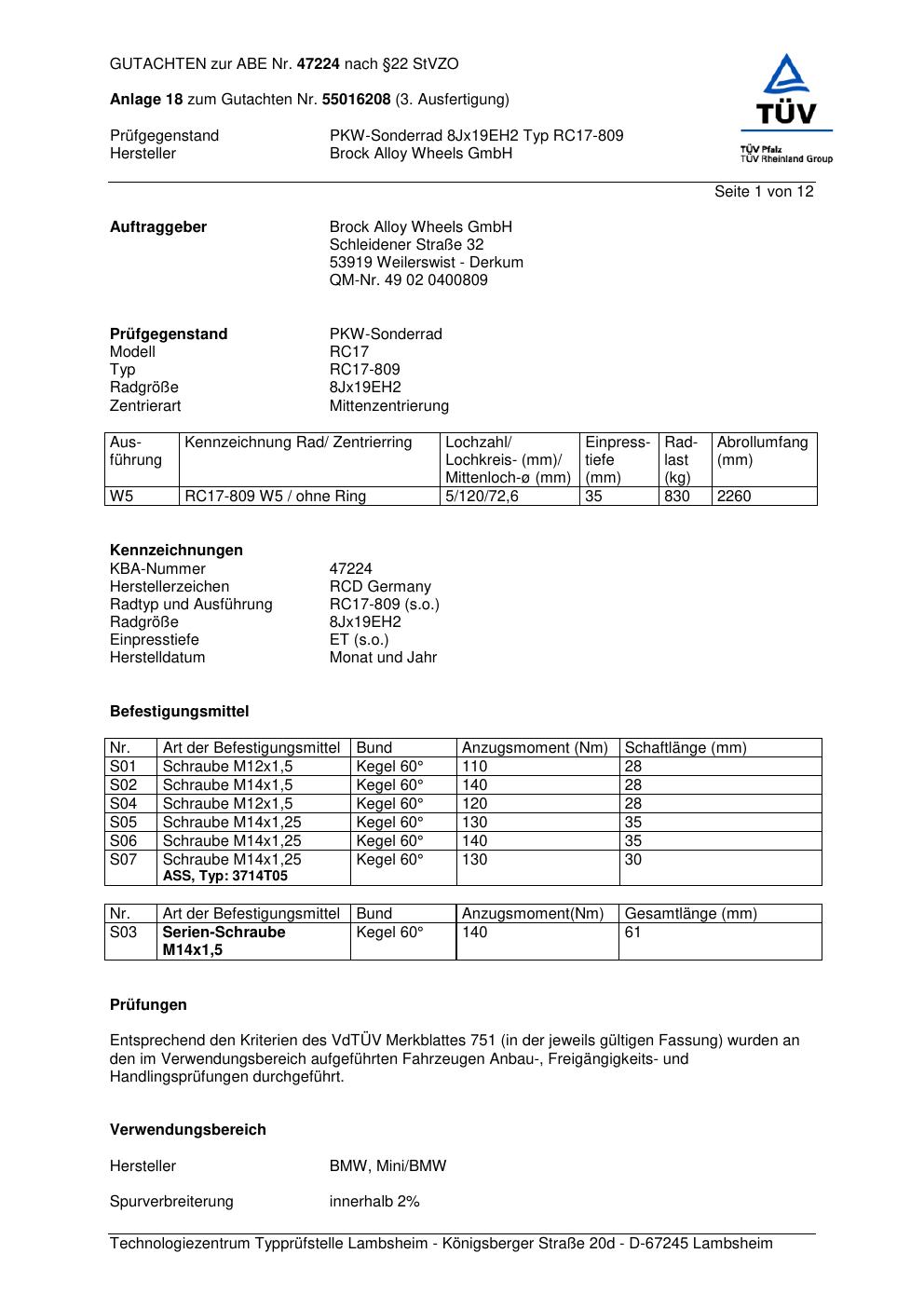 Dieses Gutachten (abe) bezieht sich auf die Alufelge Brock RC17-809 in der Ausführung ET 0, Mittenloch 0 mm (KBA 47224). Im PDF findest du typischerweise zulässige Reifengrößen, Auflagen/Anbauhinweise und – je nach Dokument – Hinweise zur Eintragung.
