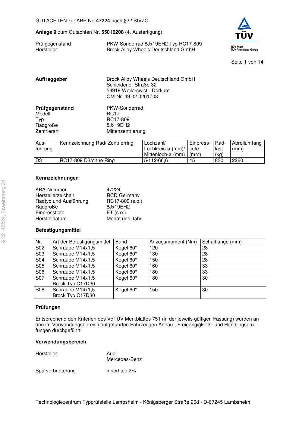 Dieses Gutachten (abe) bezieht sich auf die Alufelge Brock RC17-809 in der Ausführung ET 0, Mittenloch 0 mm (KBA 47224). Im PDF findest du typischerweise zulässige Reifengrößen, Auflagen/Anbauhinweise und – je nach Dokument – Hinweise zur Eintragung.