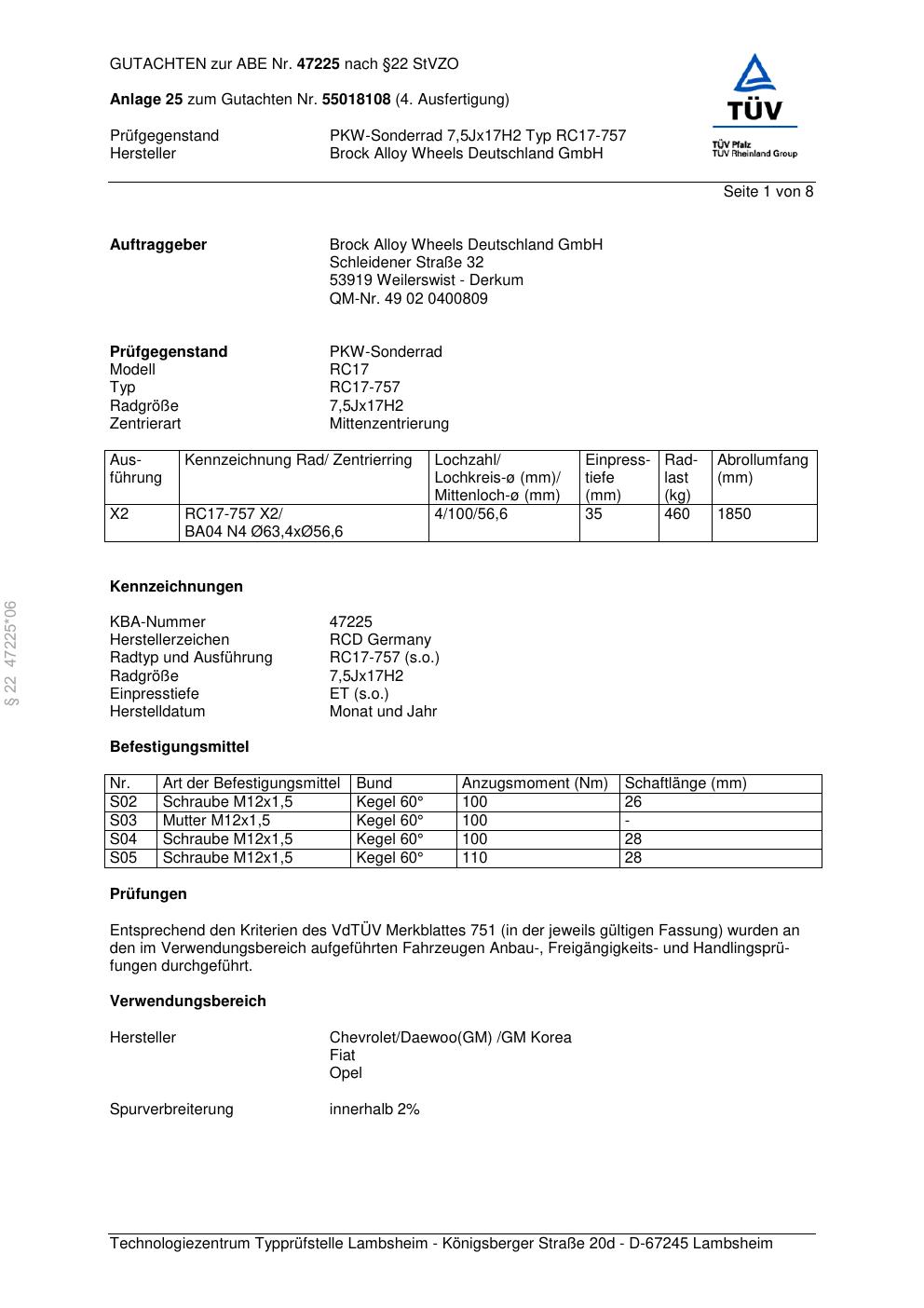 Dieses Gutachten (abe) bezieht sich auf die Alufelge Brock RC17-757 in der Ausführung 7.5Jx17 ET 0, Mittenloch 0 mm (KBA 47225). Im PDF findest du typischerweise zulässige Reifengrößen, Auflagen/Anbauhinweise und – je nach Dokument – Hinweise zur Eintragung.