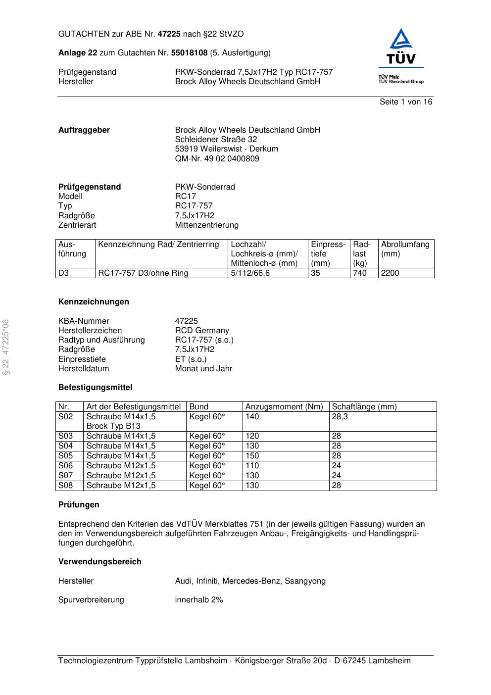 Dieses Gutachten (abe) bezieht sich auf die Alufelge Brock RC17-757 in der Ausführung 7.5Jx17 ET 0, Mittenloch 0 mm (KBA 47225). Im PDF findest du typischerweise zulässige Reifengrößen, Auflagen/Anbauhinweise und – je nach Dokument – Hinweise zur Eintragung.