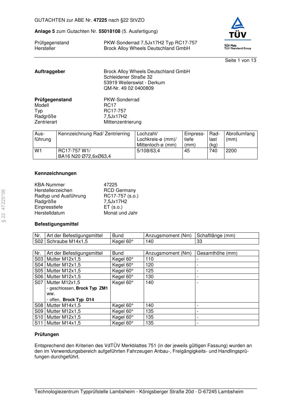 Dieses Gutachten (abe) bezieht sich auf die Alufelge Brock RC17-757 in der Ausführung 7.5Jx17 ET 0, Mittenloch 0 mm (KBA 47225). Im PDF findest du typischerweise zulässige Reifengrößen, Auflagen/Anbauhinweise und – je nach Dokument – Hinweise zur Eintragung.