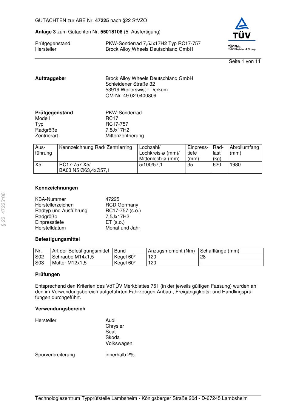 Dieses Gutachten (abe) bezieht sich auf die Alufelge Brock RC17-757 in der Ausführung 7.5Jx17 ET 0, Mittenloch 0 mm (KBA 47225). Im PDF findest du typischerweise zulässige Reifengrößen, Auflagen/Anbauhinweise und – je nach Dokument – Hinweise zur Eintragung.