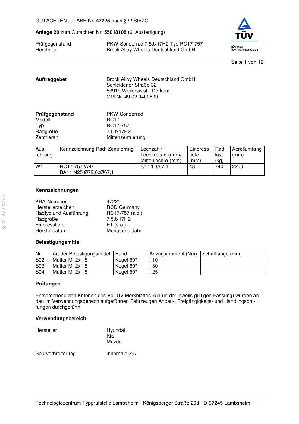 Dieses Gutachten (abe) bezieht sich auf die Alufelge Brock RC17-757 in der Ausführung 7.5Jx17 ET 0, Mittenloch 0 mm (KBA 47225). Im PDF findest du typischerweise zulässige Reifengrößen, Auflagen/Anbauhinweise und – je nach Dokument – Hinweise zur Eintragung.