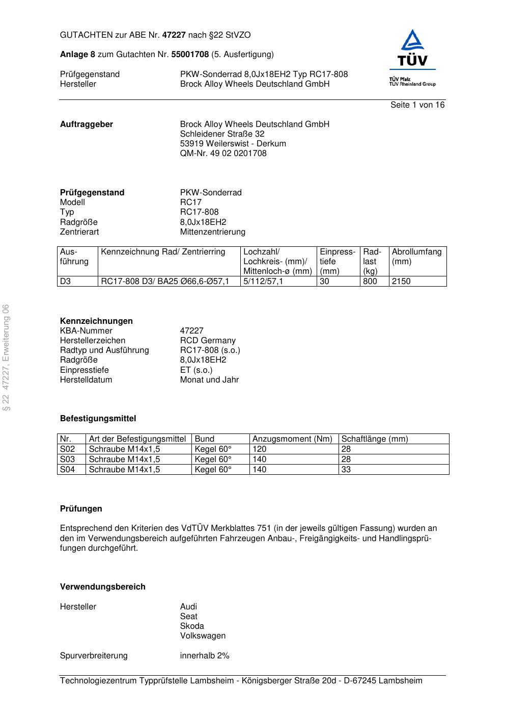 Dieses Gutachten (abe) bezieht sich auf die Alufelge Brock RC17-80 8 in der Ausführung ET 0, Mittenloch 0 mm (KBA 47227). Im PDF findest du typischerweise zulässige Reifengrößen, Auflagen/Anbauhinweise und – je nach Dokument – Hinweise zur Eintragung.