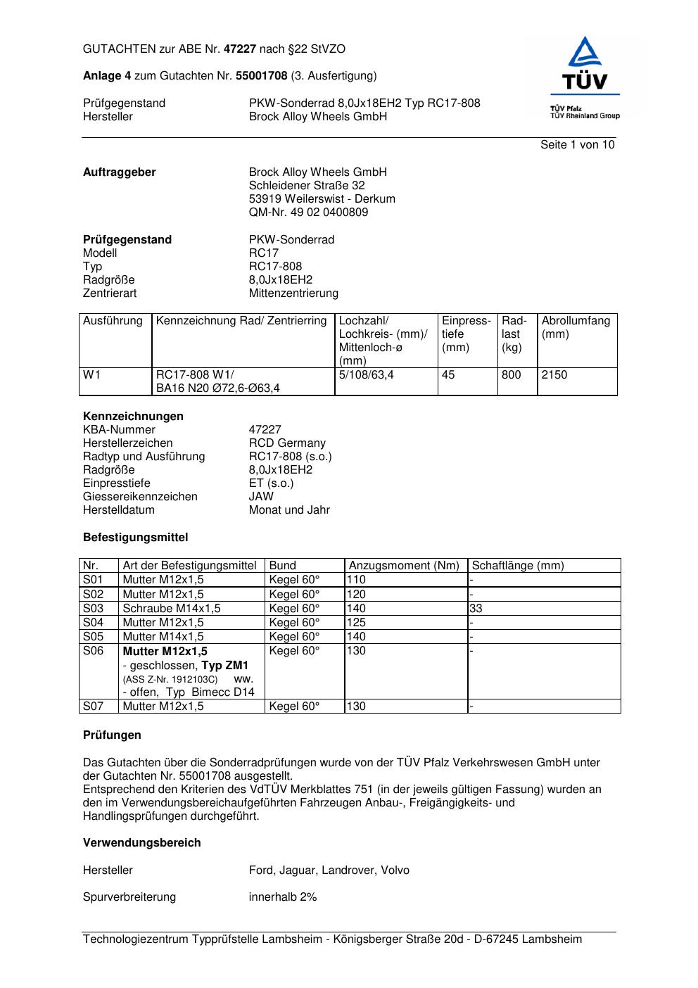 Dieses Gutachten (abe) bezieht sich auf die Alufelge Brock RC17-80 8 in der Ausführung ET 0, Mittenloch 0 mm (KBA 47227). Im PDF findest du typischerweise zulässige Reifengrößen, Auflagen/Anbauhinweise und – je nach Dokument – Hinweise zur Eintragung.