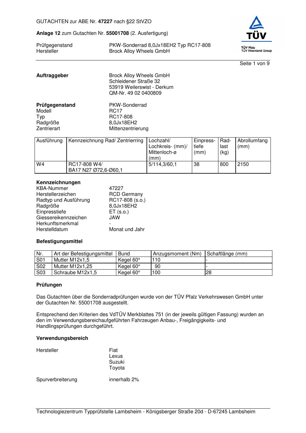 Dieses Gutachten (abe) bezieht sich auf die Alufelge Brock RC17-80 8 in der Ausführung ET 0, Mittenloch 0 mm (KBA 47227). Im PDF findest du typischerweise zulässige Reifengrößen, Auflagen/Anbauhinweise und – je nach Dokument – Hinweise zur Eintragung.