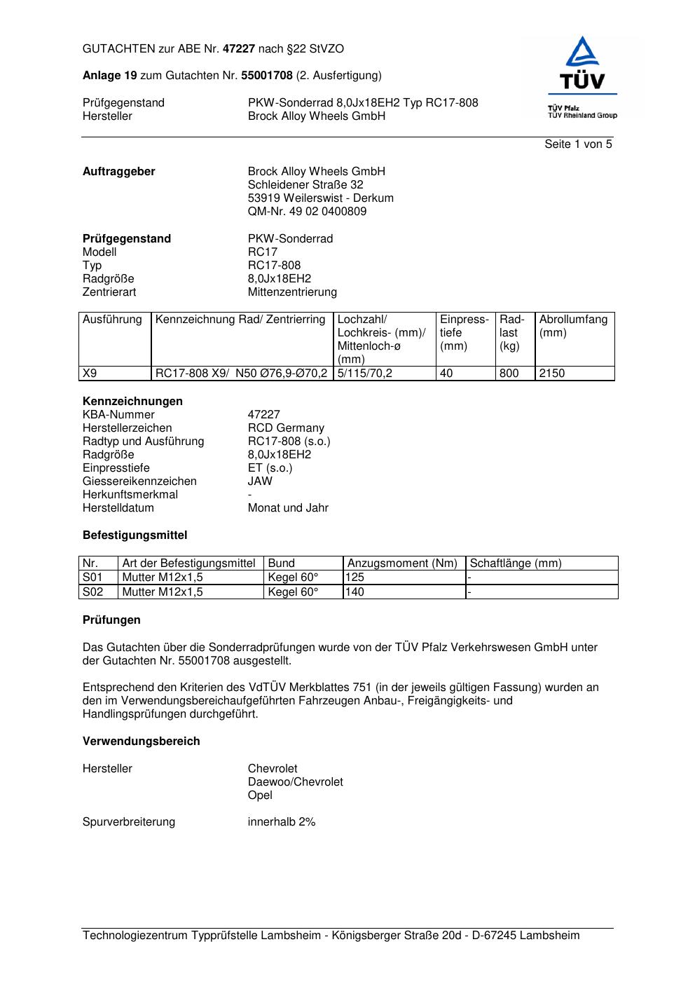 Dieses Gutachten (abe) bezieht sich auf die Alufelge Brock RC17-80 8 in der Ausführung ET 0, Mittenloch 0 mm (KBA 47227). Im PDF findest du typischerweise zulässige Reifengrößen, Auflagen/Anbauhinweise und – je nach Dokument – Hinweise zur Eintragung.