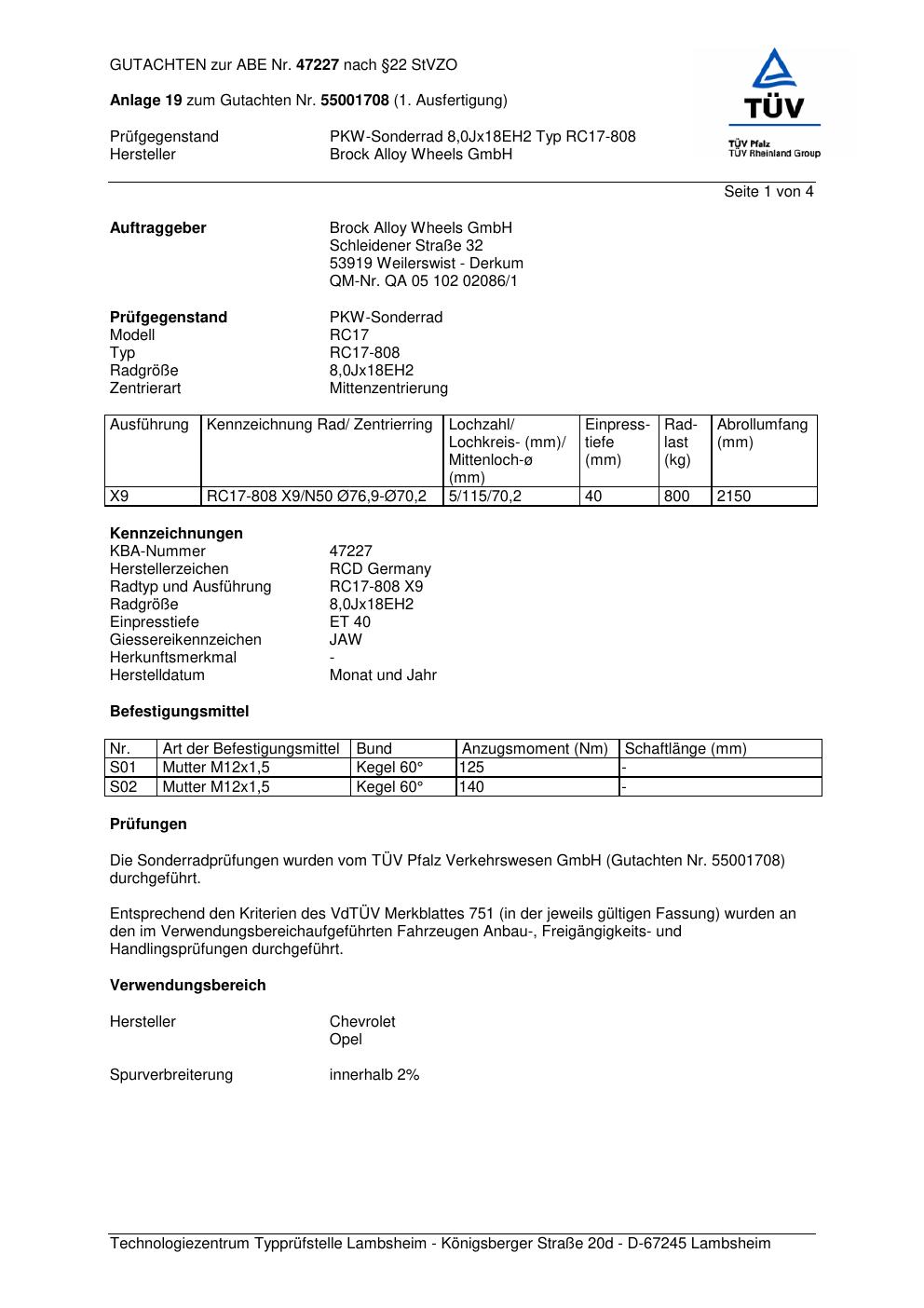 Dieses Gutachten (abe) bezieht sich auf die Alufelge Brock RC17-80 8 in der Ausführung ET 0, Mittenloch 0 mm (KBA 47227). Im PDF findest du typischerweise zulässige Reifengrößen, Auflagen/Anbauhinweise und – je nach Dokument – Hinweise zur Eintragung.