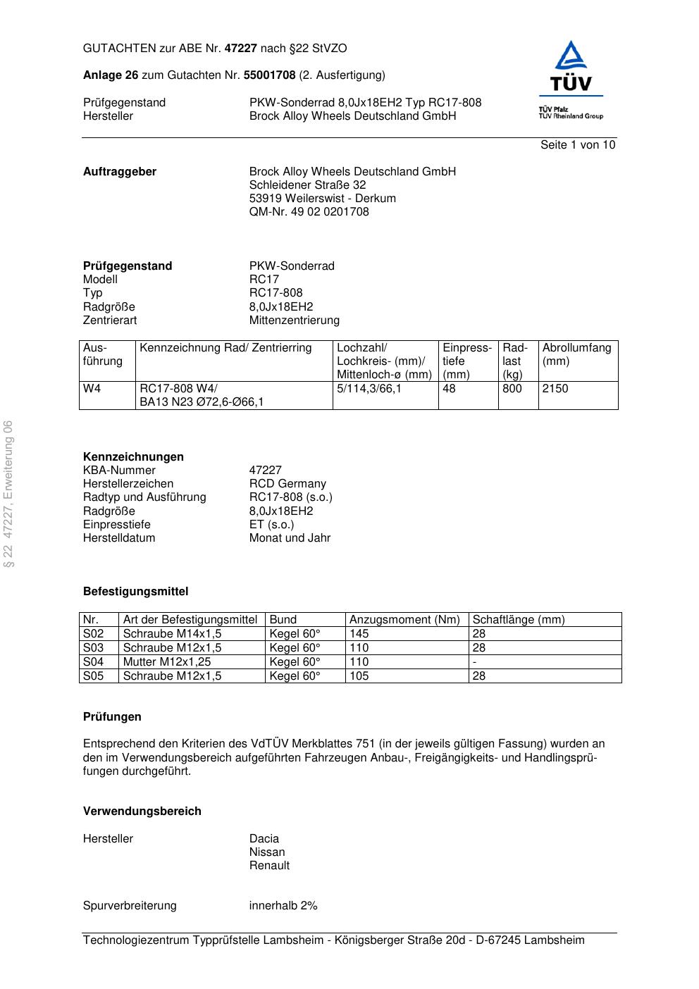 Dieses Gutachten (abe) bezieht sich auf die Alufelge Brock RC17-80 8 in der Ausführung ET 0, Mittenloch 0 mm (KBA 47227). Im PDF findest du typischerweise zulässige Reifengrößen, Auflagen/Anbauhinweise und – je nach Dokument – Hinweise zur Eintragung.