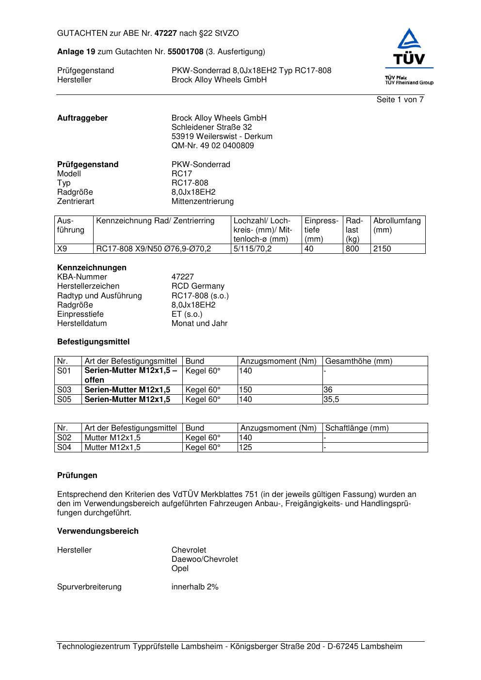Dieses Gutachten (abe) bezieht sich auf die Alufelge Brock RC17-80 8 in der Ausführung ET 0, Mittenloch 0 mm (KBA 47227). Im PDF findest du typischerweise zulässige Reifengrößen, Auflagen/Anbauhinweise und – je nach Dokument – Hinweise zur Eintragung.