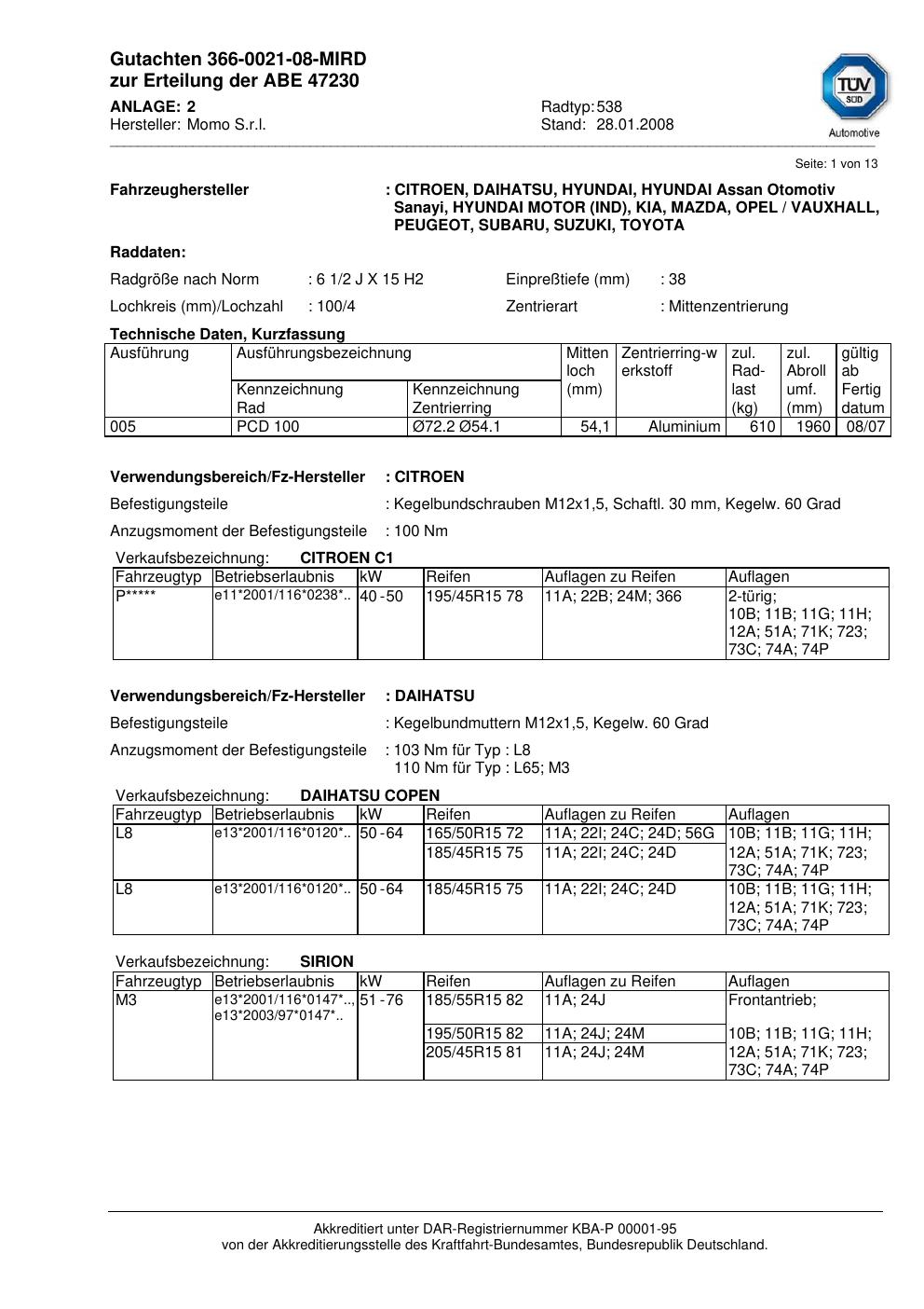 Dieses Gutachten (abe) bezieht sich auf die Alufelge brand-momo 538 in der Ausführung 2Jx15 ET 0, Mittenloch 0 mm (KBA 47230). Im PDF findest du typischerweise zulässige Reifengrößen, Auflagen/Anbauhinweise und – je nach Dokument – Hinweise zur Eintragung.