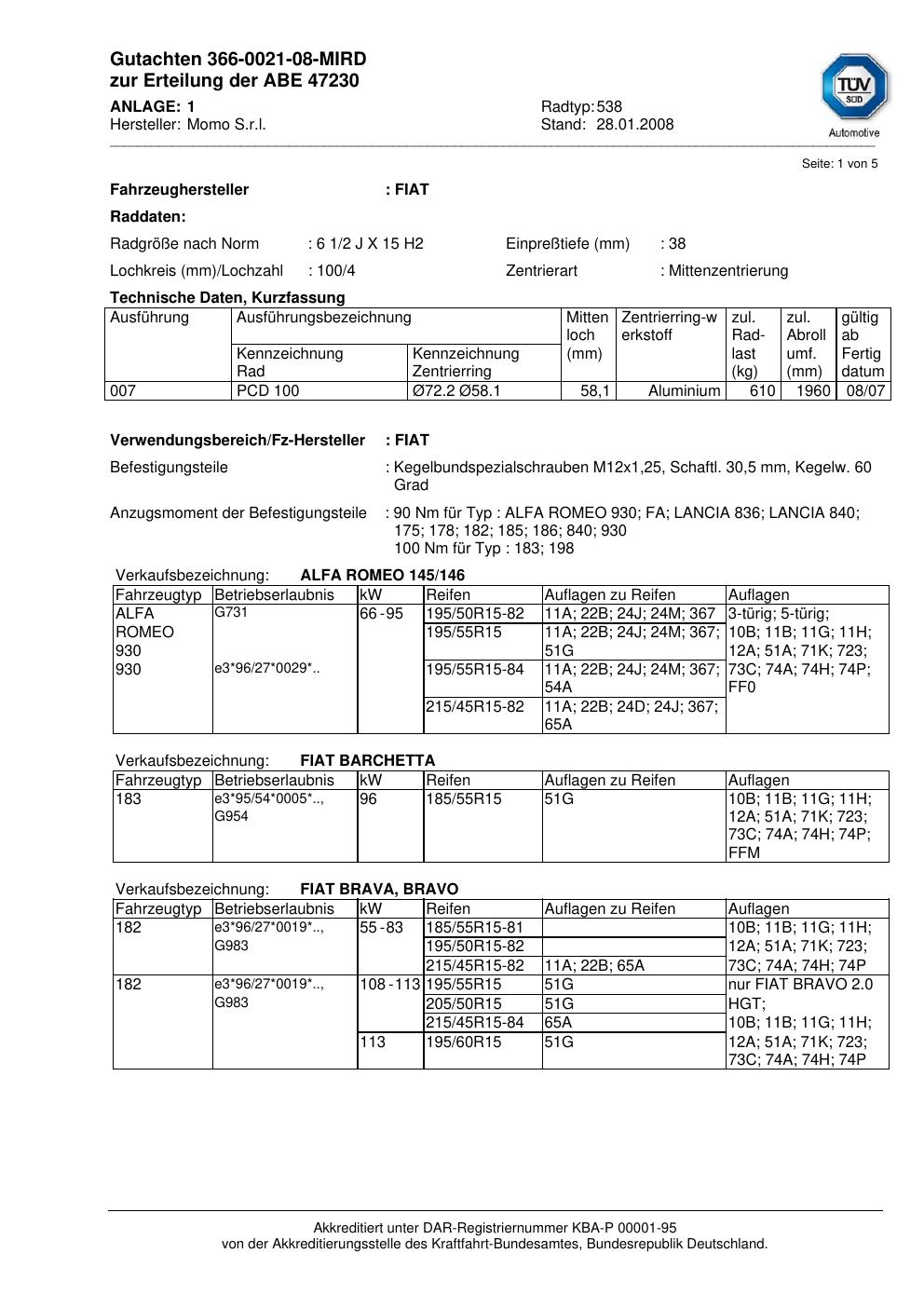 Dieses Gutachten (abe) bezieht sich auf die Alufelge brand-momo 538 in der Ausführung 2Jx15 ET 0, Mittenloch 0 mm (KBA 47230). Im PDF findest du typischerweise zulässige Reifengrößen, Auflagen/Anbauhinweise und – je nach Dokument – Hinweise zur Eintragung.