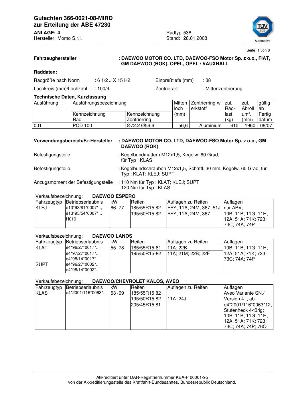 Dieses Gutachten (abe) bezieht sich auf die Alufelge brand-momo 538 in der Ausführung 2Jx15 ET 0, Mittenloch 0 mm (KBA 47230). Im PDF findest du typischerweise zulässige Reifengrößen, Auflagen/Anbauhinweise und – je nach Dokument – Hinweise zur Eintragung.