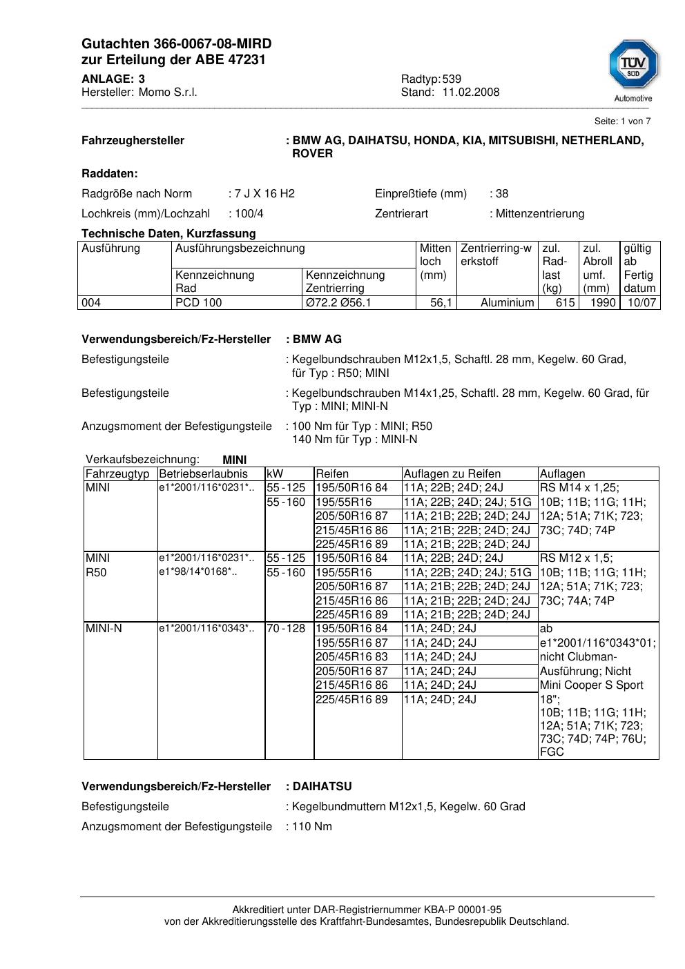 Dieses Gutachten (abe) bezieht sich auf die Alufelge brand-momo 539 in der Ausführung 7Jx16 ET 0, Mittenloch 0 mm (KBA 47231). Im PDF findest du typischerweise zulässige Reifengrößen, Auflagen/Anbauhinweise und – je nach Dokument – Hinweise zur Eintragung.