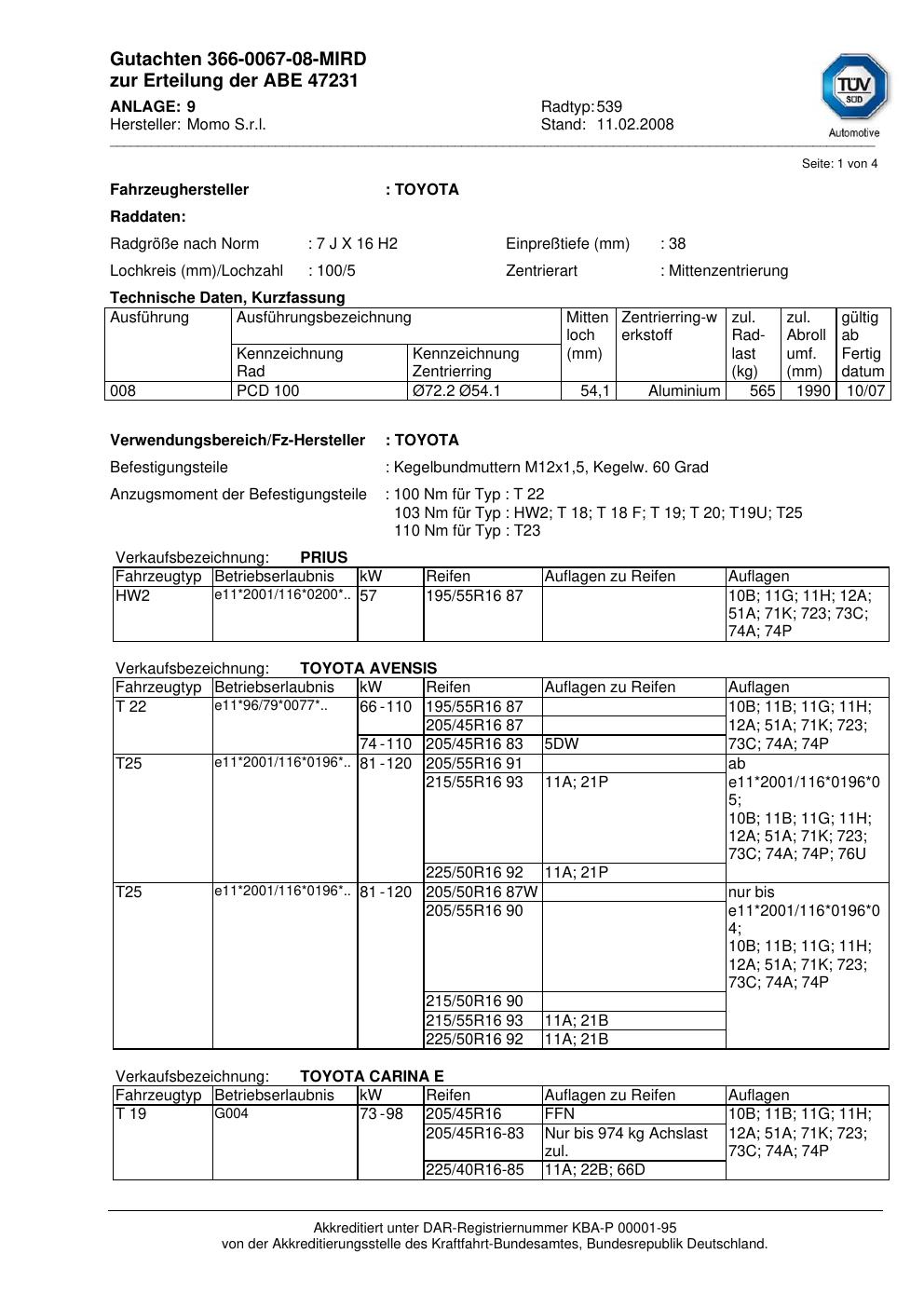 Dieses Gutachten (abe) bezieht sich auf die Alufelge brand-momo 539 in der Ausführung 7Jx16 ET 0, Mittenloch 0 mm (KBA 47231). Im PDF findest du typischerweise zulässige Reifengrößen, Auflagen/Anbauhinweise und – je nach Dokument – Hinweise zur Eintragung.