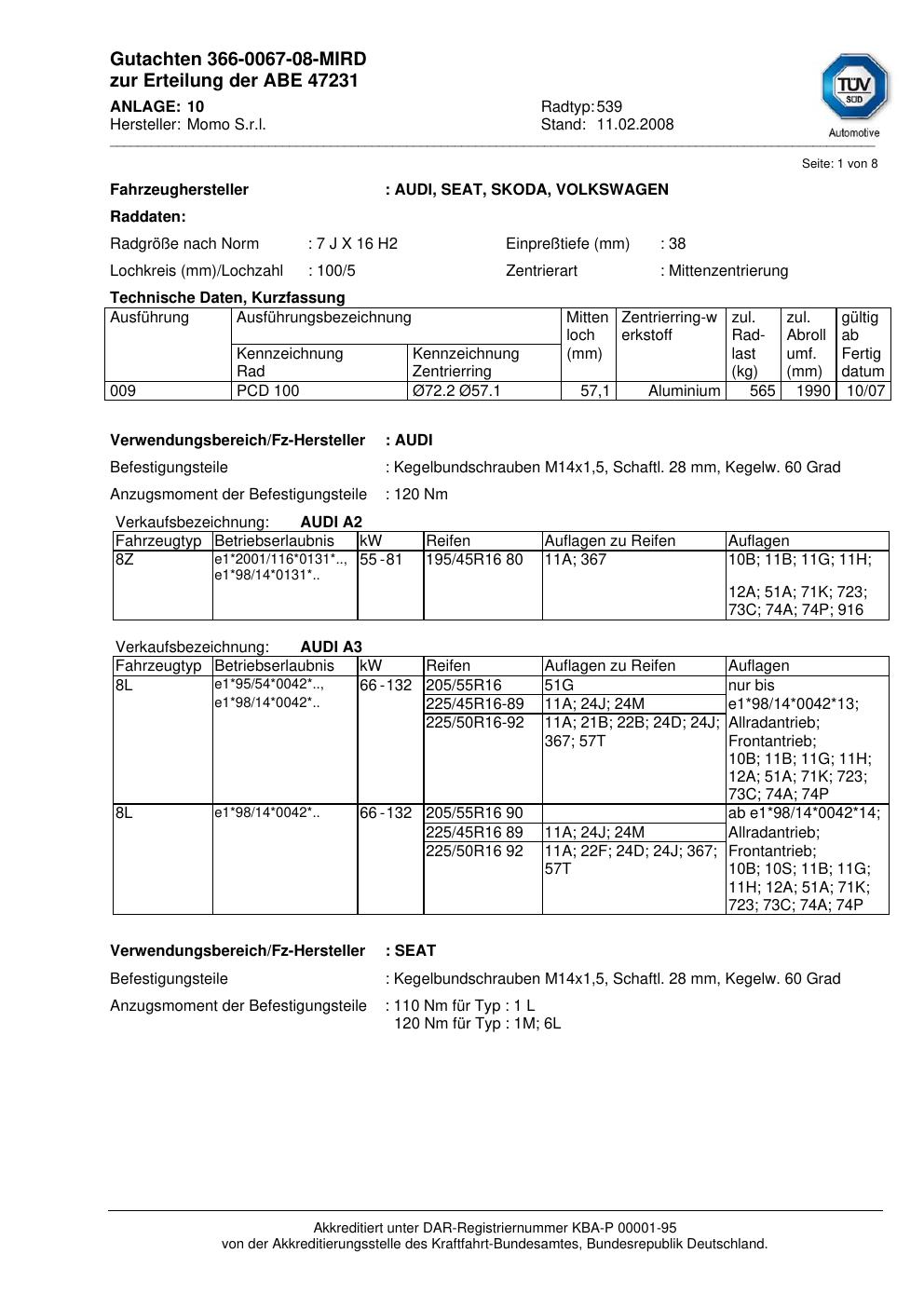 Dieses Gutachten (abe) bezieht sich auf die Alufelge brand-momo 539 in der Ausführung 7Jx16 ET 0, Mittenloch 0 mm (KBA 47231). Im PDF findest du typischerweise zulässige Reifengrößen, Auflagen/Anbauhinweise und – je nach Dokument – Hinweise zur Eintragung.