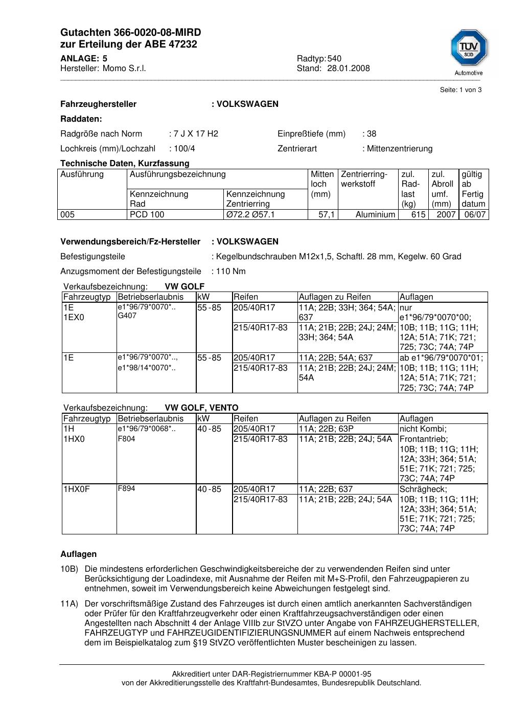Dieses Gutachten (abe) bezieht sich auf die Alufelge brand-momo 540 in der Ausführung 7Jx17 ET 0, Mittenloch 0 mm (KBA 47232). Im PDF findest du typischerweise zulässige Reifengrößen, Auflagen/Anbauhinweise und – je nach Dokument – Hinweise zur Eintragung.