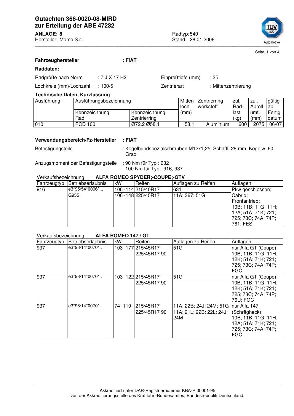 Dieses Gutachten (abe) bezieht sich auf die Alufelge brand-momo 540 in der Ausführung 7Jx17 ET 0, Mittenloch 0 mm (KBA 47232). Im PDF findest du typischerweise zulässige Reifengrößen, Auflagen/Anbauhinweise und – je nach Dokument – Hinweise zur Eintragung.