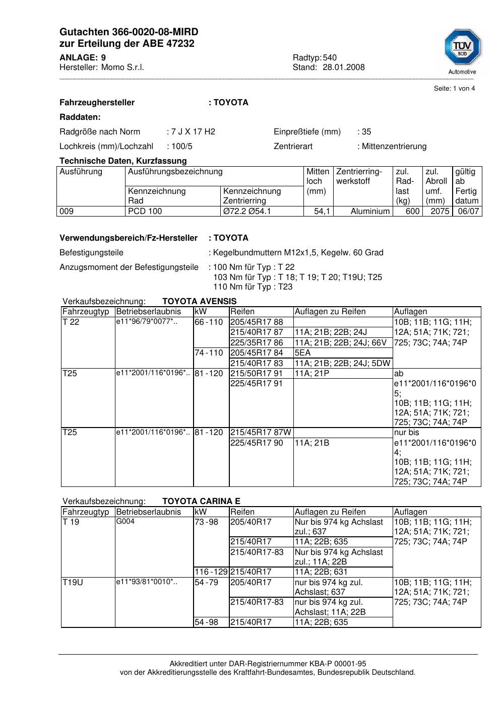 Dieses Gutachten (abe) bezieht sich auf die Alufelge brand-momo 540 in der Ausführung 7Jx17 ET 0, Mittenloch 0 mm (KBA 47232). Im PDF findest du typischerweise zulässige Reifengrößen, Auflagen/Anbauhinweise und – je nach Dokument – Hinweise zur Eintragung.