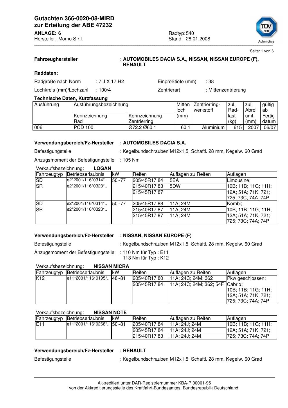 Dieses Gutachten (abe) bezieht sich auf die Alufelge brand-momo 540 in der Ausführung 7Jx17 ET 0, Mittenloch 0 mm (KBA 47232). Im PDF findest du typischerweise zulässige Reifengrößen, Auflagen/Anbauhinweise und – je nach Dokument – Hinweise zur Eintragung.