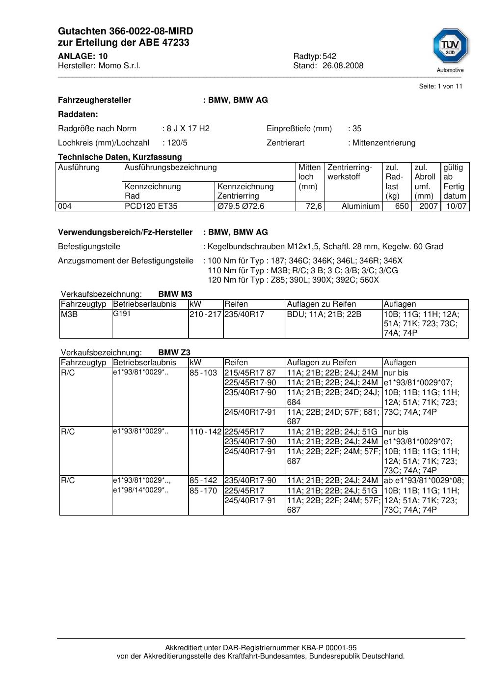 Dieses Gutachten (abe) bezieht sich auf die Alufelge brand-momo 542 in der Ausführung 8Jx17 ET 0, Mittenloch 0 mm (KBA 47233). Im PDF findest du typischerweise zulässige Reifengrößen, Auflagen/Anbauhinweise und – je nach Dokument – Hinweise zur Eintragung.